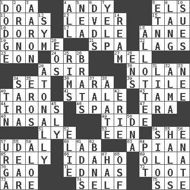 ACROSS 1. ___ good deed 4. Actor Griffith 8. Raised railways 11. Mouths or openings 13. Crowbar 15. The 19th letter of the Greek alphabet 16. Small, narrow, flatbottom fishing boat 17. Dipping utensil 18. Queen of England 1702-14 19. Dwarf 21. Health resort 22. Fails to keep up a pace 23. Period of immesurable duration 24. Globe 27. Cartoonist voice _ Blanc 29. SW Saudi Arabia district 30. Pitcher Ryan 34. Put into a specified state 36. Hindu Mythology: god of death 39. Vertical member of a panel or frame 40. Pacific island yam 41. Having lost freshness 43. Not wild 44. Metal shackles 46. Coast Guard woman 47. Period 48. Rhinal 49. Event that recurs at intervals 51. Potassium hydroxide 53. Car or cant ending 54. A female animal or person 57. Freehold land 60. Experiment locale 63. Bee-related 65. Depend 66. Potato state 69. Spanish pot 70. E Mali city 71. Ferber et al. 72. A blast of a horn 73. "We ___ not amused" (Victoria) 74. Oneself 75. Compass dir. DOWN 1. Evade 2. U. of Maine site 3. Composer Copland 4. Everything 5. Teachers' org. 6. Movie discs 7. Sharp bark 8. Inactive volcano in Sicily 9. Long (Scottish) 10. Institutes legal proceedings 12. Symbol (abbr.) 14. 480, 500 or 516 sheets of paper 18. One to whom something is allotted 20. Greek goddess of the dawn 25. Basketball hoops 26. Naughty children 28. Followers of ems 29. Without tonality 31. One who doesn't tell the truth 32. _ mater 33. Born 34. "Two Mules for Sister ____" 35. Greek god of love 37. Strike 38. Having winglike extensions 40. Shallow baking pan 42. 4th largest of the Great Lakes 45. Secret 50. Heredity factor (abbr.) 52. Writer Wiesel 54. Grain storage towers 55. Radiant circles of light 56. Related on the mother's side 57. Capital and largest city of Mongolia 58. Letter starter 59. _ vera 61. Does sums 62. Object of repulsion 64. Cooking vessel 67. Actor Linden 68. Order of Saint Francis (abbr.)
