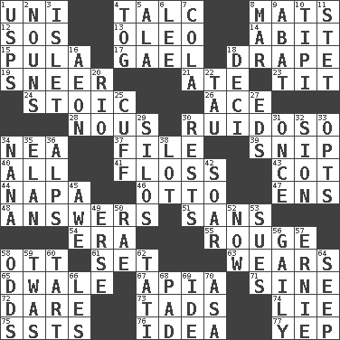 ACROSS 1. Corn or form start 4. Baby powder 8. Floor coverings 12. Mayday 13. Margarine 14. "This won't hurt ____!" 15. Monetary unit of Botswana 17. Highlander 18. Window treatment 19. Contemptuous expression 21. Had dinner 23. Teat (slang) 24. Unemotional 26. Adept person 28. Common sense 30. Noisy, rowdy, vocal (Spanish) 34. Teachers' org. 37. Do some clerical work 39. Sever or remove by pinching or nipping 40. Everything 41. Soft thread for cleaning between teeth 43. Small bed 44. California wine valley 46. Von Bismarck 47. Followers of ems 48. Replies (to) 51. Without 54. Epoch 55. Makeup applied to the cheeks 58. Baseball player Mel 61. Put into a specified state 63. Erodes 65. A sleeping potion; an opiate (poet.) 67. Capital of Western Samoa 71. Trig term 72. Have the gumption 73. Bits 74. Untruth 75. Fast planes 76. The main thing one is thinking about 77. Slangy assent DOWN 1. United States Postal Service (abbr.) 2. Parts of speech 3. Small island 4. Coat; cloak 5. Insect wing 6. Area sheltered from the wind 7. Root beer relative 8. Make imperfect 9. Blind as ____ 10. Native american tent (variation) 11. Proofreading order 16. A really long time 18. Tenth: prefix 20. _ de Janeiro 22. The 19th letter of the Greek alphabet 25. _ links 27. Begley and Asner 29. Grain storage towers 30. Musical pauses 31. At one time in the past 32. The Jewish people; Israel 33. Chooses 34. Nanny 35. Enthusiasm 36. High mountains 38. Car dealer's back yard 42. Fly high 45. Deep reverence 49. Celtic language 50. Actress Charlotte 52. Immediately 53. Institutes legal proceedings 56. Lightheartedly 57. Bert's buddy 58. Likelihood 59. It was, poetically 60. Small pie 62. Jacques of French films 64. Ooze 66. French article 68. Writing tablet 69. Binary compound 70. White ___ sheet