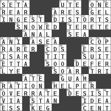 ACROSS 1. Stalk of a moss capsule 5. Shoshoni 8. Single 11. Buttocks 12. Ancient Greek god of war 13. Set 14. Swallow 17. What propaganda does 19. Overwhelmed 21. Cylindrical with tapered ends 22. Of or related to the anus 23. Ocean 24. Black tropical American cuckoo 27. At sea 29. Police officer (slang) 32. More valued for its uncommonness 34. Music discs 36. Celtic language 37. Austrian river, tributary to the Danube 38. Teat (slang) 39. Set or collection 40. Singer James 41. "Barney Miller" actor Jack 42. Put off 43. Sodium hydroxide 44. Fly high 46. Three (prefix) 47. Had dinner 50. Island territory of the United States 52. Food allowance for one day 55. Aide 57. Make much ado about nothing 59. Cease 62. By way of 63. Comedian Laurel of Laurel & Hardy 64. The content of cognition 65. Double-curved letter 66. Cask 67. Penny DOWN 1. Indian title of respect (Mr.) 2. Car or cant ending 3. Labels 4. Sports stadium 5. RI univ. 6. Trials 7. First name in cosmetics 8. Legendary monster 9. Remaining after all deductions 10. Otherwise 12. Find the sum of 15. Underwater navigation system 16. It was, poetically 18. Mouth or opening 20. Opts 24. Satellite of Uranus 25. Difficult 26. Feeling or showing extreme anger 28. Goodbye (Sp.) 29. An unpleasant substance 30. Flexible twig of a willow tree 31. _ dish (used to culture cells) 33. Period 35. Moe Howard, for one 36. Compass dir. 42. Window treatment 45. Old (Scot.) 47. Wind 48. Cod relative 49. Related on the mother's side 51. Of or pertaining to a meson 52. Be footloose 53. Opinion 54. Afternoon social gatherings 55. Layer 56. Travel on or in a vehicle 58. Label 60. Elected rep. 61. Make lace