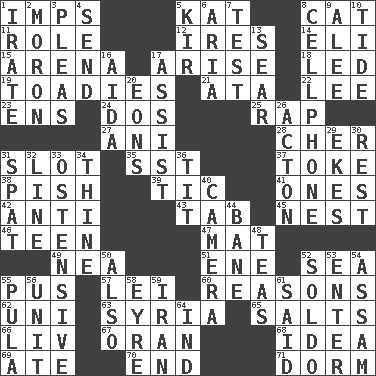 ACROSS 1. Naughty children 5. Krazy ___ of comics 8. Domesticated feline 11. Hero or heavy, e.g. 12. Angers 14. Connecticut Ivy Leaguer 15. Sports stadium 17. Originate 18. Directed 19. Sycophants 21. _ moment's notice (2 wds.) 22. Area sheltered from the wind 23. Followers of ems 24. Two (Sp.) 25. Reproach for some lapse or misdeed 27. Black tropical American cuckoo 28. "Mermaids" star 31. Notch 35. Fast jet (abbr.) 37. Puff or smoke 38. Expression of disdain 39. Nervous spasm 41. Washington bills 42. Opposed to 43. Bar bill 45. A home for chicks 46. Adolescent 47. Floor protector 49. Teachers' org. 51. Compass dir. 52. Ocean 55. Suppuration 57. Flowery wreath 60. Thinks logically 62. University (slang) 63. Damascus' land 65. Table seasonings 66. 54 in ancient Rome 67. NW Algerian seaport 68. The content of cognition 69. Had dinner 70. Conclude 71. Dormintory (informal) DOWN 1. Feeling or showing extreme anger 2. Person of subnormal intelligence 3. Entreaties 4. Transmit 5. Apertif with cassis 6. Operatic vocal solo 7. Trial 8. Portable communications device 9. Toward shelter 10. Event that recurs at intervals 13. Scorch 16. Opera by Verdi 17. Help 20. Immeasurably long periods of time 26. NE Massachussets city 29. Supplements with great effort 30. State of inaction 31. Argument over a trivial matter 32. Actor's bit 33. Clearly or manifestly demonstrative 34. One or ones belonging to thee 36. Teat (slang) 40. Device for capturing images 44. Object of repulsion 48. Afternoon social gatherings 50. In addition 52. Twentieth part of a lira 53. Keyboard key 54. Indian state 55. Monetary unit of Botswana 56. A single undivided whole 58. Jane of fiction 59. SW Asia republic 61. Alleged 64. Indiana (abbr.)