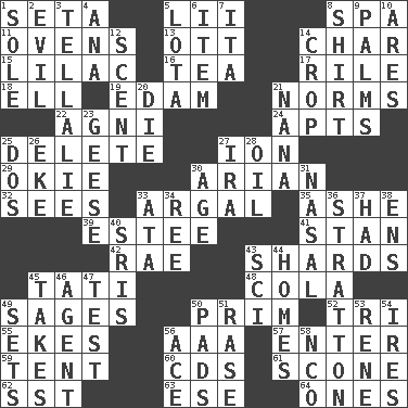 ACROSS 1. Stalk of a moss capsule 5. Cards in a Roman deck? 8. Health resort 11. Baking chambers 13. Baseball player Mel 14. Burn to charcoal 15. Pale purple color 16. Afternoon social gathering 17. Cause heat under the collar 18. Pipe bend 19. Dutch treat 21. Typical standards 22. Hindu god of fire 24. Flats, for short 25. Keyboard key 27. Electrically charged atom 29. Migrant worker of the '30s 30. Believer in; advocate of (suffix) 32. Observes 33. Therefore, facetiously 35. American tennis player Robert 39. First name in cosmetics 41. Comedian Laurel of Laurel & Hardy 42. Actress Charlotte 43. Broken pieces 45. Jacques of French films 48. Root beer relative 49. Gurus 50. Demure 52. Three (prefix) 55. Supplements with great effort 56. American Automobile Association (abbr.) 57. Keyboard key 59. Portable shelter 60. Music discs 61. Biscuitlike quick bread 62. Fast jet (abbr.) 63. Compass dir. 64. Singles DOWN 1. Flatfish 2. Tending to cause great harm 3. Copy Pinocchio 4. Santa ___, CA 5. Globular water bottle used in Asia 6. A distinct part 7. Call ___ day 8. Upper-body garment 9. Insides of hands 10. Ancient Greek god of war 12. Odor 14. Riding implement 20. Pass on 21. Nanny 23. Honkers 25. Two (Sp.) 26. Supplement with great effort 27. Lyricist Gershwin 28. Petroleum 30. Ripen 31. Relating to the nose 33. "One Day ___ Time" 34. Portuguese money of account (variant) 36. Ski resort town in Vermont 37. Possessed 38. Followers of ems 40. Indian titles of respect 43. _-fi 44. Residences 45. Proceeds 46. Rep 47. Trial 49. Puts into a specified state 50. Writing tablets 51. To erase 53. French philosopher Descartes 54. Angers 56. Adept person 58. Non-commissioned officer (abbr.)