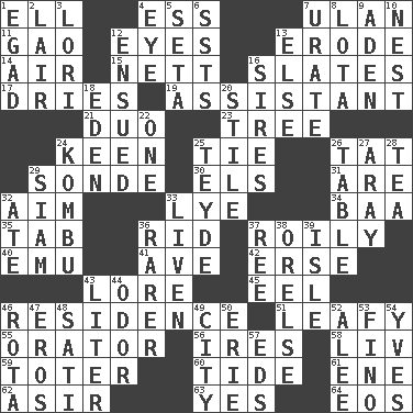 ACROSS 1. Pipe bend 4. Curvy letter 7. Uhlan (variant) 11. E Mali city 12. Sight organs 13. Wear away 14. Atmosphere 15. Remaining after all deductions 16. Chalkboards 17. Frees from moisture 19. Helper 21. Superhero pair 23. Family _ (genealogy) 24. Peachy ____! 25. Standoff 26. Make lace 29. Message 30. Raised railways 31. "We ___ not amused" (Victoria) 32. Direct toward a target or goal 33. Sodium hydroxide 34. Sound made by sheep 35. Bar bill 36. To free from 37. Turbulent 40. Australian flightless bird 41. "___ Maria" 42. Celtic language 43. Old wives' tales, e.g. 45. Snakelike fish 46. Dwelling 51. Like summer trees 55. Speaker 56. Angers 58. 54 in ancient Rome 59. Carrier 60. Event that recurs at intervals 61. Compass dir. 62. SW Saudi Arabia district 63. Affirmative reply 64. Greek goddess of the dawn DOWN 1. Mild oath 2. Den 3. Australian parrot (variant) 4. Sight organ 5. Stalk of a moss capsule 6. Fast planes 7. A salt of uric acid 8. Globular water bottle used in Asia 9. An important port of Yemen 10. A home for chicks 12. Followed as a consequence or result 13. Otherwise 16. Founders of families 18. Locale of original sin 20. Vertical member of a panel or frame 22. Single 24. Dried seaweed eaten as food 25. Miss Universe 1986, Barbara Palacios _ 26. Eating place 27. Like ___ of sunshine 28. Beverage made from leaves 29. Thailand, formerly 32. Had dinner 33. Make or become more lively 36. More uncommon 37. To sift 38. Threatening words 39. Capri or Wright 43. 61 cubic inches 44. Scent 46. Round or rotation of duties 47. Greek god of love 48. Suttee (variant) 49. Municipality 50. One of the Great Lakes 52. Toward shelter 53. A pale, very dry sherry 54. Jacques Cousteau's middle name 57. Begley and Asner