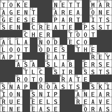 ACROSS 1. Casino tip 5. Remaining after all deductions 9. Impair 12. Representative 14. Type of rug 15. Single 16. Honkers 17. Piece 18. It is 19. Elected rep. 20. Cause to be 23. Inconspicuous attention getter 24. "Mermaids" star 25. A blast of a horn 27. Silent film actress Nazimova 30. Allow head to fall sleepily 32. Environmental prefix 33. Spoils 34. Lyric poems 36. Definite Article 38. Fitting 39. Erode 40. Marina Del _, California 43. White ___ sheet 46. Broad, flat, thick piece 48. Celtic language 49. Affectionate concern, for short 51. Title for a knight 52. Fast planes 53. Printing process, for short 54. Assign a rank or rating to 56. Fastener 58. Ridicules or criticizes harshly 61. What Jean-Claude Killy likes to do 64. Electrically charged atom 65. Clip 66. Approach 68. Regret 69. Snakelike fish 70. Break or tear apart 71. Compass dir. 72. Relaxation 73. Mouths or openings DOWN 1. Labels 2. Double curve, resembling the letter S 3. Peachy ____! 4. Followers of ems 5. California wine valley 6. Part of Q.E.F. 7. Cigar-shaped 8. Make lace 9. Wet 10. Pismires 11. Respite 13. Technology 21. Former U.S. Attorney General Janet 22. Eats (away) 23. "Silly old bear" 24. Feline 26. Sep. follower 27. Insect wing 28. Trim (branches) 29. Globular water bottle used in Asia 31. Allots cards 35. Flight of steps 37. Blunders 41. Eastern Standard Time (abbr.) 42. Consenting reply 44. Obstruct or block passage 45. Keyboard modifier key 47. Naughty child 48. Compass dir. 50. Pupil covering 53. Indian princess (variant) 55. Russian ruler of old 56. Father 57. Part of speech 59. Lubricates 60. Domed church section 61. Wither 62. Polynesian shrub of the pepper family 63. Angers 65. Perceive with the eye 67. Modern: prefix
