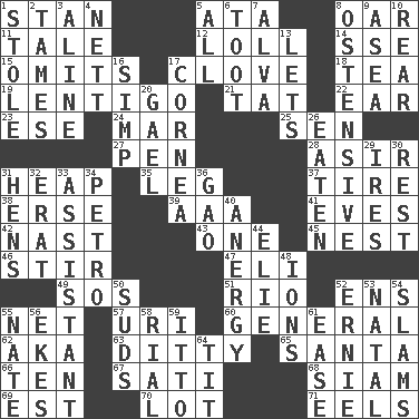 ACROSS 1. Comedian Laurel of Laurel & Hardy 5. "One Day ___ Time" 8. Rowing implement 11. Falsehood 12. Hang loosely or laxly 14. Compass dir. 15. Leaves out 17. Garlic unit 18. Afternoon social gathering 19. Small, flat, pigmented spot on the skin 21. Make lace 22. Ewer handle 23. Compass dir. 24. Third mo. 25. Elected rep. 27. Writing instrument 28. SW Saudi Arabia district 31. Pile 35. Part of a journey 37. Hoop that covers a wheel 38. Celtic language 39. American Automobile Association (abbr.) 41. Nights before holidays 42. Political cartoonist Thomas 43. Single 45. A home for chicks 46. Agitate 47. Biblical high priest 49. Mayday 51. _ de Janeiro 52. Followers of ems 55. Fish or hair follower 57. RI univ. 60. Commissioned military rank 62. Alias (abbr.) 63. Simple song 65. Before Barbara or Clara 66. "___ Little Indians" 67. Suttee (variant) 68. Thailand, formerly 69. Eastern Standard Time (abbr.) 70. Car dealer's back yard 71. Snakelike fish DOWN 1. Took without asking 2. Makes less strong or intense 3. Place in a line 4. Remaining after all deductions 5. 100% 6. A blast of a horn 7. Inventor's middle name 8. Clearly or manifestly demonstrative 9. Toward the sea 10. Bring up, as a child 13. Allows 16. Simple or foolish person 17. Pupil covering 20. Highlander 26. Eroded 29. Angers 30. Relief 31. Coop moms 32. Part of Q.E.F. 33. Aide 34. Stone: prefix 36. E Mali city 40. Disorder of the immune system 44. Writer Wiesel 48. Charged particles 50. Beer foam 52. Bert's buddy 53. Brizilian seaport 54. Hits or strikes with great force 55. Nathan's nickname 56. Makes supply last 58. Monetary unit of Yemen 59. "Tell ____ the Marines!" 61. Relaxation 64. Teat (slang)