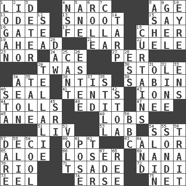 ACROSS 1. Flaplike covering 4. Drug cop 8. Grow older 11. Lyric poems 13. Snout, nose 15. Declare 16. Yard entry 17. Man or boy (slang) 18. "Mermaids" star 19. Having the leading position 21. Hearing organ 22. Ubangi River tributary 23. Or not 24. Adept person 27. For each 29. It was, poetically 30. Fur scarf 34. Had dinner 36. Nuclear Threat Initiatives 39. Unit of acoustic absorption 40. Lick closed 41. Portable shelters 43. Charged particles 44. For Whom the Bell _____ 46. Prepare for publication 47. Born 48. Approach 49. Tennis shots 51. 54 in ancient Rome 53. Experiment locale 54. Fast jet (abbr.) 57. Tenth: prefix 60. Choose 63. Bodily heat indicating an inflammation 65. Medicinal plant 66. Failure 69. Nanny 70. River (Sp.) 71. Sadhe (variant) 72. "You Light Up My Life" star Conn 73. Snakelike fish 74. Celtic language 75. Fish or hair follower DOWN 1. Utah city north of Ogden 2. Potato state 3. Prevent from occurring 4. Science/research agcy. 5. A saturated hydrocarbon 6. Hero or heavy, e.g. 7. Root beer relative 8. American tennis player Robert 9. Highlander 10. Jane of fiction 12. Ocean 14. Canvas cover 18. Window treatments 20. Obsolete 25. Patter 26. First name in cosmetics 28. Curvy letter 29. Copy Pinocchio 31. Mitch Miller's instrument 32. Actor's bit 33. Followers of ems 34. Period of immesurable duration 35. Falsehood 37. Working for oneself (abbr.) 38. Not moving 40. R.R. building 42. Portico 45. Indian title of respect (Mr.) 50. English channel? 52. Electrical Unit 54. Killed 55. Message 56. Distinguishing feature 57. Have the gumption 58. Writer Wiesel 59. Calm and collected 61. Airs 62. Russian ruler of old 64. Plus 67. Begley and Asner 68. To separate or throw off