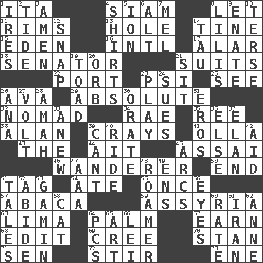 ACROSS 1. Call ___ day 4. Thailand, formerly 8. Allow 11. Basketball hoops 13. Hollow 14. Prong on a fork 15. Paradise 16. International (abbr.) 17. Having or resembling wings 18. Elected representative 21. Costumes for special activities 22. Sweet dark-red dessert wine 23. Air pressure measure (abbr.) 25. Perceive with the eye 26. Actress Gardner 29. Utter; complete 32. Wanderer 34. Actress Charlotte 35. To riddle 38. Actor Alda or Thicke 39. Trading vessels 41. Rounded earthenware pot or jar 43. Definite Article 44. Small island 45. Slender Brazilian palm 46. Roamer 50. Conclude 51. Label 54. Had dinner 55. At one time in the past 57. Phillipine bananalike plant 59. Nineveh was its capital 63. Pale green bean 64. Inside of hand 67. Merit 68. Prepare for publication 69. Algonquian 70. Comedian Laurel of Laurel & Hardy 71. Elected rep. 72. Use a swizzle stick 73. Compass dir. DOWN 1. Angers 2. Event that recurs at intervals 3. So be it 4. Upper-body garments 5. Electrically charged atom 6. The first octave above the treble staff 7. Cartoonist voice _ Blanc 8. Ms. Damita and namesakes 9. Maternal 10. Laconic 12. Fastener 14. The 19th letter of the Greek alphabet 19. Frog relative 20. Globe 21. Be seated 23. Live dramatic performance 24. Institutes legal proceedings 26. Santa ___, CA 27. Electrical Unit 28. Housemaid 30. Speak pompously 31. Greek god of love 33. Afresh 36. Otherwise 37. Liveliness 39. Patter 40. Travel on an animal 42. Assist 45. Curves 47. American Automobile Association (abbr.) 48. Wanderer 49. Followers of ems 51. Stories 52. Stay 53. Street urchin 56. Sight organs 58. Feline 60. Assign a rank or rating to 61. SW Asia republic 62. Queen of England 1702-14 64. Personal Computers (abbr.) 65. Nonscientific branch of learning 66. Luau accessory