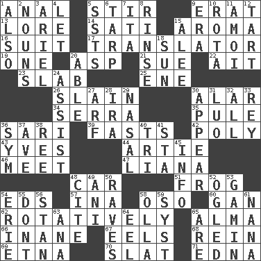 ACROSS 1. Of or related to the anus 5. Commotion 9. Part of Q.E.F. 13. Old wives' tales, e.g. 14. Suttee (variant) 15. Scent 16. Set or collection 17. Interpreter 19. Single 20. Viper 21. Institute legal proceedings 22. Small island 23. Broad, flat, thick piece 25. Compass dir. 26. Killed 30. Having or resembling wings 34. Spanish missionary in California 35. Whimper 36. Indian skirt 39. Goes without food and/or water 42. Many (prefix) 43. Jacques Cousteau's middle name 44. Nick name for Arthur 46. Rendezvous 47. Woody, climbing, usually tropical plant 48. 4-wheeled motor vehicle 51. Toadlike animal 54. Begley and Asner 57. _ tizzy (2 wds.) 58. Bear (Spanish) 60. Separate the seeds from cotton 62. Producing rotation 65. _ mater 66. Silly 67. Snakelike fish 68. It's straight from the horse's mouth 69. Inactive volcano in Sicily 70. Narrow board 71. Pulitzer Prize-winning author Ferber DOWN 1. In addition 2. Parts of speech 3. Satellite of Uranus 4. Allow 5. Fast planes 6. Canvas cover 7. Call ___ day 8. Remove soap 9. Period 10. Roll call or roster of names 11. Mine, in Marseilles 12. Small pie 15. Toward shelter 18. Player for Phoenix 20. Competent 24. Help 27. Sandy's bark 28. Lyricist Gershwin 29. Relating to the nose 30. Seem 31. Nilotic language 32. Everything 33. Marina Del _, California 36. Symbol (abbr.) 37. "___ Maria" 38. To riddle 40. Three (prefix) 41. R.R. building 45. A message received and understood 48. Quote 49. Black tropical American cuckoo 50. All-night dance parties 52. Stared 53. Homeless child 54. 4th largest of the Great Lakes 55. Do not 56. Comedian Laurel of Laurel & Hardy 58. Rounded earthenware pot or jar 59. System (abbr.) 61. Nanny 63. Santa ___, CA 64. Snakelike fish 65. "We ___ not amused" (Victoria)