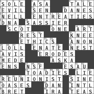 ACROSS 1. Flatfish 5. White ___ sheet 8. Lie 12. Tending to cause great harm 13. Elected rep. 14. Natives or inhabitants of Denmark 15. 1994 drama film starring Jodie Foster 16. Pleas 19. Heredity factor (abbr.) 20. More impudent 21. Highlander 23. Single 24. Tate display 27. State of inaction 30. Leg joint 31. Value system 34. Soon (poet.) 35. Hang loosely or laxly 38. Maternal 40. Egg locale 41. Opinion 42. Eats (away) 44. Ancient Persian 45. "____ silly question..." 46. Followers of ems 47. Science/research agcy. 50. He sold his birthright 53. Sycophants 57. Untruth 59. One who advocates reunion 63. Trig term 64. Fertile tracts in a desert 65. Daniel's nick name 66. International (abbr.) 67. Cy Young winner Saberhagen 68. Retirement account (abbr.) 69. Beverages made from leaves DOWN 1. Post 2. Baking chambers 3. Pale purple color 4. Pipe bend 5. At sea 6. Elected reps. 7. Pismires 8. Make lace 9. Black tropical American cuckoo 10. Area sheltered from the wind 11. Double-curved letter 14. Have the gumption 17. River (Sp.) 18. Car or cant ending 20. Proofreading order 22. Threatening words 24. Queen of England 1702-14 25. Vintage cars 26. Portable shelter 28. A female animal or person 29. Prong on a fork 30. Sunflower state 32. Automobile 33. Portico 35. Unable to walk 36. Baking chamber 37. Flaplike coverings 39. Begley and Asner 43. Makes supply last 47. Nuclear Threat Initiatives 48. "Barney Miller" actor Jack 49. Avid follower 51. Place in a line 52. National forest in Provo, Utah 54. "You Light Up My Life" star Conn 55. Austrian river, tributary to the Danube 56. Inactive volcano in Sicily 58. Snakelike fish 59. Director Reiner 60. Ewer handle 61. Purpose 62. Fish or hair follower 63. Be seated