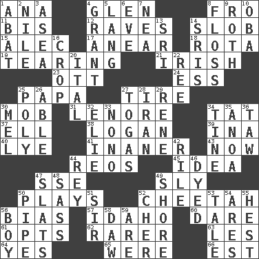 ACROSS 1. Santa ___, CA 4. Small, secluded valley 8. Away 11. Twice 12. All-night dance parties 14. Messy guy 15. Actor Baldwin 17. Approach 18. Roll call or roster of names 19. Pulling into pieces 21. From or relating to Ireland 23. Baseball player Mel 24. Curvy letter 25. Dad 27. Hoop that covers a wheel 30. Crowd into 31. Poe poem 34. Make lace 37. Pipe bend 38. Utah city north of Ogden 39. _ tizzy (2 wds.) 40. Potassium hydroxide 41. Sillier 43. At this time 44. Vintage cars 45. The content of cognition 47. Compass dir. 49. Secret 50. Romps 52. Leopard's kin 56. Prejudice 57. Potato state 60. Have the gumption 61. Chooses 62. Less widely known 63. French article 64. It is so 65. Past tense of be (plural) 66. Eastern Standard Time (abbr.) DOWN 1. Blind as ____ 2. "Death on the ____" 3. Toward the sea 4. Monetary aid 5. Austrian-born American filmmaker Fritz 6. First lady 7. Teachers' org. 8. Soft thread for cleaning between teeth 9. Writer of Portnoy's Complaint (1969) 10. Chief or king in Benin or Nigeria 13. Indian title of respect (Mr.) 14. Indian titles of respect 16. Riding implement 20. Slanted text style (abbr.) 22. Portuguese money of account (variant) 25. Many (prefix) 26. Competent 27. Ancient Roman robes 28. SW Asia republic 29. French philosopher Descartes 30. Cartoonist voice _ Blanc 32. Writer Wiesel 33. Words to Nanette 34. Prong on a fork 35. Small Philippine buffalo 36. The 23rd letter of the Hebrew alphabet 42. Cause heat under the collar 44. Marina Del _, California 46. Colored 47. Narrow boards 48. Backtalk 49. Dinah or Pauly 50. Corncob 51. Title for a knight 52. "Mermaids" star 53. Story 54. Ancient Greek god of war 55. Behest 56. Male child 58. Obsolete 59. "We ___ not amused" (Victoria)