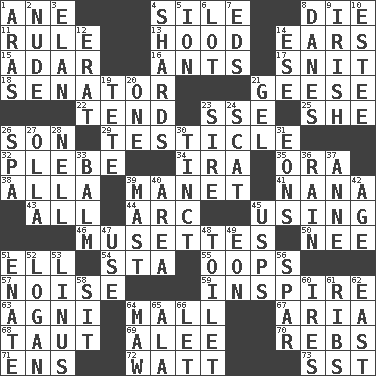 ACROSS 1. A saturated hydrocarbon 4. Filth; sediment 8. Pass on 11. Court order 13. Parka part 14. Hearing organs 15. The sixth month of the Jewish calendar 16. Pismires 17. In a ____ (agitated or irritated) 18. Elected representative 21. Honkers 22. Be inclined (to) 23. Compass dir. 25. A female animal or person 26. Manchild 29. One of the two male reproductive glands 32. First-year military academy student 34. Retirement account (abbr.) 35. Mouth or opening 38. Silent film actress Nazimova 39. French painter Edouard 41. Grandmother 43. 100% 44. Curve 45. Putting into practice 46. French bagpipes 50. Born 51. Pipe bend 54. R.R. building 55. I made a mistake 57. Annoying sound 59. Stimulate to action 63. Hindu god of fire 64. Promenade 67. Operatic vocal solo 68. Strained 69. Toward shelter 70. Confederate soldiers (slang) 71. Followers of ems 72. Electrical Unit 73. Fast jet (abbr.) DOWN 1. Ancient river in northeast Turkey 2. Naked 3. Enthusiasm 4. Pottery fragments 5. Electrically charged atom 6. Car dealer's back yard 7. Begley and Asner 8. Natives or inhabitants of Denmark 9. From or relating to Ireland 10. First name in cosmetics 12. Part of Q.E.F. 14. Compass dir. 19. Wig 20. Single 21. Set 23. Father 24. Scram, to a cat 26. Health resort 27. Spanish pot 28. 1994 drama film starring Jodie Foster 30. Tinged 31. Immeasurably long periods of time 33. Lip ointment 36. Precipitation 37. Queen of England 1702-14 39. Vertical spar for supporting sails 40. Length times width 42. Personal question 45. United States Postal Service (abbr.) 47. Purpose 48. Bathroom 49. Period of immesurable duration 51. Maternal 52. Utah city north of Ogden 53. "_ and Lucy" (Charlie Brown theme song) 56. Coast Guard woman 58. Be seated 60. Angers 61. Teases 62. 90 degrees 64. Opening into something insatiable 65. Insect wing 66. Allow