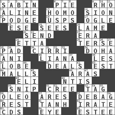 ACROSS 1. Unit of acoustic absorption 6. Sliced dessert 9. 17th letter of the Greek alphabet 12. Place in a line 13. Like (prefix) 14. The Jewish people; Israel 15. Plash 16. United States Postal Service (abbr.) 17. Stare at amorously 18. Compass dir. 19. Observes 20. Unable to walk 21. Transmit 23. Epoch 24. Singer James 25. Laconic 28. Writing tablet 30. High-altitude cloud 34. Capital of the state of Qatar 35. Black tropical American cuckoo 36. Woody, climbing, usually tropical plant 38. French article 39. Ear part 41. Allots cards 43. Eastern Standard Time (abbr.) 44. Shopping centers 46. Caspian sea tributary 48. Biblical high priest 49. Nuclear Threat Initiatives 50. Clip 51. Algonquian 53. Label 56. Margarine 57. Ancient Greek god of war 58. Debunk (Brit. slang) 60. Take ten 61. Hyperbolic tangent 62. Feeling or showing extreme anger 63. Music discs 64. Sight organ 65. First name in cosmetics DOWN 1. Plant excrement 2. Medicinal plant 3. Auction offers 4. Eat 5. Born 6. Introduce or present, as a question 7. Naughty children 8. Greek goddess of the dawn 9. Complicated, petty procedures 10. Hollow 11. Single 13. Took on color 14. Flew 19. Slow-paced one 20. Allow 22. And so on (abbr.) 24. The property of being fit to eat 26. "______ My Girl" (Turtles hit) 27. Compass direction 28. Inside of hand 29. Small Philippine buffalo 31. To free from 32. Actress Charlotte 33. _ tizzy (2 wds.) 37. Having winglike extensions 40. American author Paul (1891-1958) 42. Indian title of respect (Mr.) 45. Small drink 47. Michaelmas daisies 49. Tender 50. Downhill vehicle 51. Supercomputer manufacturer 52. French philosopher Descartes 54. Blind as ____ 55. Yard entry 56. The grampus (Milton) 57. Had dinner 58. Pass on 59. Unit of force equal to gravity