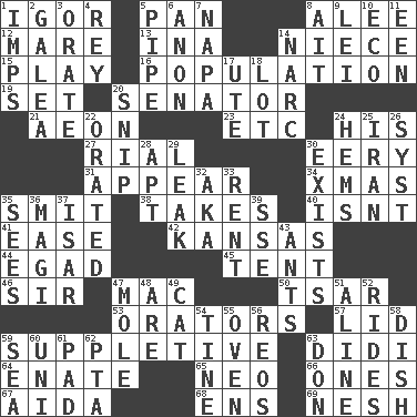 ACROSS 1. Russian composer Stravinsky 5. Baking dish 8. Toward shelter 12. Female horse 13. _ tizzy (2 wds.) 14. Sibling's daughter 15. Romp 16. Census information 19. Put into a specified state 20. Legislator 21. Period of immesurable duration 23. And so on (abbr.) 24. Part of HMS, perhaps 27. Monetary unit of Yemen 30. Suggestive of the supernatural 31. Become visible 34. Dec. holiday 35. Stricken, poetically 38. Proceeds 40. Is not 41. Relaxation 42. Sunflower state 44. Mild oath 45. Portable shelter 46. Title for a knight 47. Big _ 50. Russian ruler of old 53. Speakers 57. Hat (slang) 59. Supplying deficiencies 63. "You Light Up My Life" star Conn 64. Maternal 65. Modern: prefix 66. Washington bills 67. Opera by Verdi 68. Followers of ems 69. Soft DOWN 1. Naughty children 2. An organ shaped like a helmet 3. Speak pompously 4. Marina Del _, California 5. Corncob 6. Soon (poet.) 7. California wine valley 8. Small island 9. Luau accessory 10. Environmental prefix 11. Car or cant ending 14. Drug cop 17. Shoshoni 18. Car dealer's back yard 20. Clip 22. Spoke pompously 24. Is hesitant and indecisive 25. SW Asia republic 26. System (abbr.) 28. Fitting 29. Path through which fluid escapes 30. Is extant 32. Alias (abbr.) 33. Monthly bill 35. Observes 36. Wise men 37. Austrian river, tributary to the Danube 39. Compass dir. 43. Pismires 47. Undercover agent 48. "We ___ not amused" (Victoria) 49. Domesticated feline 51. Place in a line 52. Amusement-park features 54. Prong on a fork 55. Baking chamber 56. Vintage cars 58. Food container 59. Ocean 60. Single; one (prefix) 61. Groovy apt. 62. Parent Teacher Assoc. 63. Spanish title