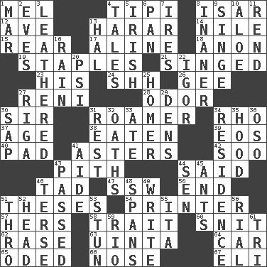 ACROSS 1. Cartoonist voice _ Blanc 4. Native american tent (variation) 8. Austrian river, tributary to the Danube 12. "___ Maria" 13. Ethiopian city, capital of Harari 14. "Death on the ____" 15. Hitchcock's "____ Window" 17. Place in a line 18. Soon (poet.) 19. Paper fasteners 21. Burned superficially 23. Part of HMS, perhaps 24. Quiet! 26. Turn to the right 27. Painter Guido (1575-1642) 28. Scent 30. Title for a knight 31. Nomad 34. 17th letter of the Greek alphabet 37. Ripen 38. Consumed 39. Greek goddess of the dawn 40. Groovy apt. 41. Michaelmas daisies 42. "Barney Miller" actor Jack 43. Essential or central part 44. Expressed in words 46. Bit 47. Compass dir. 50. Conclude 51. College papers 54. Hard copy producer 57. Possessive pronoun 58. Distinguishing feature 60. In a ____ (agitated or irritated) 62. To erase 63. National forest in Provo, Utah 64. Auto 65. Wrote a lyric poem 66. Characteristic smell of wine 67. Connecticut Ivy Leaguer DOWN 1. Spoil 2. Nights before holidays 3. Tough but pliablecoriaceous 4. Lies 5. From or relating to Ireland 6. Baking dish 7. Angers 8. Sillier 9. Burn superficially 10. _ vera 11. Tear apart 13. Actor Linden 16. Water falling in drops from the sky 20. 23rd letter of the Greek alphabet 22. Composer Stravinsky 25. Baseball hit which scores a run 27. Port city in Latvia 29. Habitations of wild animals 30. Plant excrement 31. Take ten 32. Curses 33. Had dinner 34. Dwelling 35. Parka part 36. Bear (Spanish) 41. Assistant 43. Went by 44. Elected rep. 45. Pismires 46. Laconic 48. Connects, as a bridge 49. Compose 51. Through, poetically 52. Froth on beer 53. Surprise greatly 55. Call ___ day 56. Monetary unit of Yemen 59. River (Sp.) 61. Three (prefix)