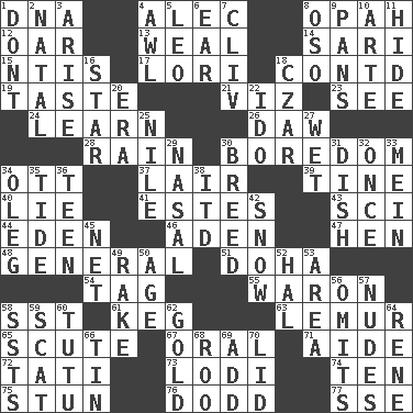ACROSS 1. Heredity factor (abbr.) 4. Actor Baldwin 8. Brightly colored fish 12. Rowing implement 13. Welt 14. Indian skirt 15. Nuclear Threat Initiatives 17. Australian parrot (variant) 18. Continued (abbr.) 19. Clothes sense 21. That is 23. Perceive with the eye 24. Memorize 26. Simpleton 28. Precipitation 30. Mood resulting from idleness 34. Baseball player Mel 37. Den 39. Prong on a fork 40. Whopper 41. _____ Park, CO 43. _-fi 44. Paradise 46. Arabian gulf 47. Layer 48. Commissioned military rank 51. Capital of the state of Qatar 54. Label 55. Make _____ (do battle with) 58. Fast jet (abbr.) 61. Barrel 63. Arboreal primate 65. Snake scale 67. Taken by mouth 71. Assistant 72. Jacques of French films 73. Farming town in central California 74. Nine, plus one 75. Astound 76. Texas town _ City 77. Compass dir. DOWN 1. Do not 2. Relating to or accompanying birth 3. Ascend 4. Leather borer 5. Lion 6. Ewer handle 7. 154 in Roman numerals 8. Bear (Spanish) 9. Baking dishes 10. Johnson of "Laugh-In" 11. Flintstone garb 16. Play the lead 18. Russian ruler of old 20. Period 22. Wedding promise 25. "Death on the ____" 27. Dripping 29. Rhinal 30. A special lineage 31. Food container 32. At one time in the past 33. Count _ (2 wds.) 34. Cassini of fashion 35. Periodic rise and fall of the sea level 36. Adolescent 38. It would 42. Overwhelm 45. Fish or hair follower 49. Immoral or dissolute person 50. Ripen 52. Actor Linden 53. Length times width 56. Leaves out 57. Unclothed pictures 58. Fast planes 59. Go away! 60. Ballerina skirt 62. Aureate 64. French philosopher Descartes 66. Shallow baking pan 68. Friend of Pooh 69. Increase 70. Hat (slang)