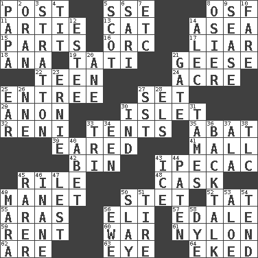ACROSS 1. Mail 5. Compass dir. 8. Order of Saint Francis (abbr.) 11. Nick name for Arthur 13. Domesticated feline 14. Toward the sea 15. Pieces 16. The grampus (Milton) 17. One who doesn't tell the truth 18. Santa ___, CA 19. Jacques of French films 21. Honkers 22. Adolescent 24. 1/640 square mile 25. Main course 27. Arrange properly for use 29. At once, immediately (arch.) 30. Small island 32. Painter Guido (1575-1642) 33. Portable shelters 35. Blind as ____ 39. Having ears or earlike features 41. Shopping center 42. Storage container 43. Medicinal drug used to evoke vomiting 45. Cause heat under the collar 48. Keg 49. French painter Edouard 50. Proofreading order 52. Make lace 55. Ancient river in northeast Turkey 56. Biblical high priest 57. Peak District village in England 59. Monthly bill 60. Armed conflict 61. High-strength synthetic material 62. "We ___ not amused" (Victoria) 63. Sight organ 64. Supplemented with great effort DOWN 1. Dad 2. NW Algerian seaport 3. Ski resort town in Vermont 4. Teat (slang) 5. Native of Scotland 6. Indian skirt 7. And so on (abbr.) 8. Flexible twig of a willow tree 9. Gospel singer Marvin 10. Conductor's collection 12. First name in cosmetics 14. Actor Baldwin 20. One (Scot) 21. Yard entry 23. Bert's buddy 25. Hearing organ 26. Compass dir. 27. Fast jet (abbr.) 28. Raised railways 30. Working for oneself (abbr.) 31. Corrects by punishment or discipline 33. Three (prefix) 34. Car or cant ending 36. Sass 37. Chicken ___ king 38. Affectionate concern, for short 40. Collude with 43. Frozen water 44. Eucharist need 45. More uncommon 46. Lacking in sense or substance 47. For fear that 49. Hindu Mythology: god of death 50. Kill 51. Become fatigued 53. Medicinal plant 54. Look after 56. She-sheep 58. Color