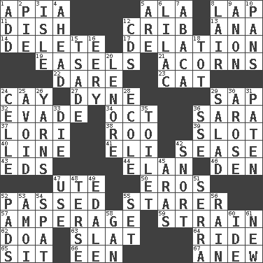ACROSS 1. Capital of Western Samoa 5. According to 8. Pet locale 11. Food container 12. Baby bed with high sides 13. Santa ___, CA 14. Erase 17. Conveyance 19. Artist's stands 21. Oak nuts 22. Have the gumption 23. Domesticated feline 24. Island 27. Unit of force 29. Plant excrement 32. Elude 34. Sep. follower 36. "Two Mules for Sister ____" 37. Australian parrot (variant) 38. Friend of Pooh 39. Narrow opening 40. Actor's bit 41. Connecticut Ivy Leaguer 42. Gospel singer Marvin 43. Begley and Asner 44. Liveliness 46. Lair 47. Shoshoni 50. Greek god of love 52. Went by 55. A viewer who gazes fixedly 57. Electrical Measurement 59. Put through a sieve 62. ___ good deed 63. Narrow board 64. Travel on or in a vehicle 65. Be seated 66. Car or cant ending 67. Afresh DOWN 1. Say or write further 2. Sliced dessert 3. Capri or Wright 4. Having the leading position 5. "We ___ not amused" (Victoria) 6. Pale purple color 7. Phillipine bananalike plant 8. Den 9. Soon (poet.) 10. Zero-star reviews 12. Music discs 15. Sadhe (variant) 16. Suggestive of the supernatural 18. Small child 20. Poe poem 24. Cell (Danish) 25. Prevent from happening 26. Entertaining tales 28. Learning spot: Fr. 29. First course 30. Came up 31. Eucharist need 33. Pass on 35. Bathroom plumbing fixture 36. Compass dir. 42. Derisive sound 45. Caspian sea tributary 47. Purpose 48. Laconic 49. Peak District village in England 51. Spanish missionary in California 52. Groovy apts. 53. Mine, in Marseilles 54. Petty quarrel 55. Put into a specified state 56. Precipitation 58. Separate the seeds from cotton 60. Binary compound 61. ___ Haven, CT