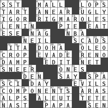 ACROSS 1. Fast jet (abbr.) 4. Promenade 8. Chops off 12. Small pie 14. Approach 16. Unsightly 17. Russian composer Stravinsky 18. Complicated, petty procedures 20. Soviet premier 1918-24 22. Sliced dessert 23. Consume 24. Compass dir. 25. Tired old horse 28. Basketball assoc. 30. Famous astronaut Armstrong 31. Large numbers or amounts 35. Call ___ day 37. Capital of the state of Qatar 40. Butter sub 41. Riding implement 42. Elude 44. Western Nevada city 45. Moist 46. Prepare for publication 47. Fish or hair follower 48. Scornful expression 50. Singles 52. Lair 54. Declare 55. Health resort 58. _-fi 61. 24 hours 63. Vices 65. Pieces 70. Ancient river in northeast Turkey 71. High mountains 72. Eskimo relative 73. Wig 74. Political cartoonist Thomas 75. Dad 76. Elected rep. DOWN 1. Vertical member of a panel or frame 2. Gurus 3. Heavy duty weighing machine 4. Third mo. 5. Cuckoo 6. Part of a journey 7. Desk light 8. Nilotic language 9. Stare at amorously 10. Entreaty 11. System (abbr.) 13. Three (prefix) 15. Precipitation 19. Confederate soldiers (slang) 21. Compass dir. 26. Assistant 27. Michael Jackson trademark 29. Oak nuts 30. Slept 32. Toward shelter 33. Scratch 34. "Barney Miller" actor Jack 35. SW Asia republic 36. Heavy book 38. Possessed 39. Goodbye (Sp.) 41. Music discs 43. Inactive volcano in Sicily 49. Make new 51. Sight organ 53. Grandmother 55. Titles for men of rank and authority 56. Food holder 57. NE Netherlands city 58. Examine hastily 59. Root beer relative 60. Naughty children 62. Sharp bark 64. Large container 66. Pacific Standard Time (abbr.) 67. Teachers' org. 68. Uncastrated adult male sheep 69. R.R. building