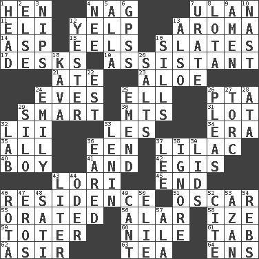 ACROSS 1. Layer 4. Tired old horse 7. ____ Bator, Mongolia 11. Biblical high priest 12. Sharp bark 13. Odor 14. Viper 15. Snakelike fish 16. Chalkboards 17. Writing tables 19. Helper 21. Had dinner 23. _ vera 24. Nights before holidays 25. Pipe bend 26. Parent Teacher Association (abbr.) 29. Don Adams' spy role 30. Mountains (abbr.) 31. Car dealer's back yard 32. Cards in a Roman deck? 33. French article 34. Epoch 35. 100% 36. Car or cant ending 37. Pale purple color 40. Male child 41. Also 42. Armor plate that protects the chest 43. Australian parrot (variant) 45. Conclusion 46. Dwelling 51. Motion picture award 55. Spoke pompously 56. Having or resembling wings 58. Ending with capital 59. Carrier 60. "Death on the ____" 61. Bar bill 62. SW Saudi Arabia district 63. Beverage made from leaves 64. Followers of ems DOWN 1. Froth on beer 2. Otherwise 3. Pinches, bites 4. Born 5. Silent film actress Nazimova 6. Global Positioning Systems (abbr.) 7. A salt of uric acid 8. Globular water bottle used in Asia 9. So be it 10. Political cartoonist Thomas 12. Last past 13. In addition 16. Beverly of Met fame 18. Polynesian shrub of the pepper family 20. Table seasonings 22. Eastern Standard Time (abbr.) 24. Poet Dickinson 25. Make improvements or corrections to 26. Entreaties 27. Torque (variant) 28. "One Day ___ Time" 29. Grain storage tower 32. Experiment locale 33. Soviet premier 1918-24 36. Having ears or earlike features 37. Area sheltered from the wind 38. Snub 39. Flaplike coverings 43. 61 cubic inches 44. Baltic tributary 46. Roll call or roster of names 47. Greek god of love 48. Suttee (variant) 49. Patter 50. Writer Wiesel 52. Quote 53. Muslim summons to prayer 54. Confederate soldiers (slang) 57. Chicken ___ king