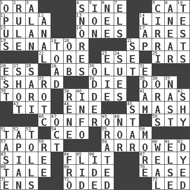 ACROSS 1. Mouth or opening 4. Trig term 8. Feline 11. Monetary unit of Botswana 13. Christmas carol 14. Actor's bit 15. ____ Bator 16. Singles 17. Ancient Greek god of war 18. Elected representative 21. Small fatty European fish 22. Old wives' tales, e.g. 23. Compass dir. 25. Big collection agency 26. Double-curved letter 29. Utter; complete 32. Pottery fragment 34. Pass on 35. Spanish title 38. "Corrida" creature 39. Amusement-park features 41. Caspian sea tributary 43. Teat (slang) 44. Compass dir. 45. Box-office sellout 46. Meet 50. Filthy place 51. Make lace 54. Corporate head (abbr.) 55. Wander 57. To the left, to Queeg 59. Moved like an arrow 63. Drop; flow; fall 64. Secret move to avoid paying debts 67. Have confidence or faith in 68. Lie 69. Travel on an animal 70. Relaxation 71. Followers of ems 72. Wrote a lyric poem 73. Directed DOWN 1. Musical composition 2. General guideline 3. ____ Jay Lerner 4. Sounds asleep 5. Electrically charged atom 6. Born 7. Raised railways 8. High-altitude cloud 9. Approach 10. Trials 12. Of or related to the anus 14. Infant locale 19. Frog relative 20. Globe 21. Put into a specified state 23. Writer Wiesel 24. Institutes legal proceedings 26. Eastern Standard Time (abbr.) 27. Guess 28. Indian skirt 30. More peculiar 31. Dutch treat 33. College mil. group 36. Mouths or openings 37. Political cartoonist Thomas 39. French philosopher Descartes 40. A message received and understood 42. Like a shrinking violet 45. Play the lead 47. Sep. follower 48. Declaimed 49. Or not 51. Clothes sense 52. Bee-related 53. For Whom the Bell _____ 56. Greater amount 58. Portuguese money of account (variant) 60. Welt 61. Otherwise 62. Colored 64. Back 65. Hat (slang) 66. Binary compound