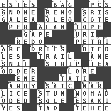 ACROSS 1. _____ Park, CO 6. Paper or plastic container 9. Personal Computers (abbr.) 12. Dwarf 13. San ____ (Riviera town) 14. Indian titles of respect 15. An organ shaped like a helmet 16. Margarine 17. ____ d'Azur (French Riviera) 18. For each 19. ____ Jay Lerner 20. Drink excessively 21. Stare wonderingly 23. RI univ. 24. Redecorate 25. _ dish (used to culture cells) 28. "We ___ not amused" (Victoria) 30. Frees from moisture 34. Passed on 35. French article 36. Hang back 38. A saturated hydrocarbon 39. In a ____ (agitated or irritated) 41. Empty completely 43. Beverage made from leaves 44. More peculiar 46. Old wives' tales, e.g. 48. Compass dir. 49. Jacques of French films 50. Actor Griffith 51. Ketch in the Levant 53. Third mo. 56. Louse (plural) 57. Surprise greatly 58. Roamer 60. Wrote a lyric poem 61. Flatfish 62. 1973 Nobel Price Winner (Physics) Leo 63. Consenting reply 64. Small boy 65. Giggle DOWN 1. Oval reproductive body of a fowl 2. Fastener 3. Lacquered or enameled metalware 4. Develop 5. Ocean 6. Actor Lugosi 7. So be it 8. Thick or sticky substance 9. Appease 10. Quote 11. Compass dir. 13. Hero or heavy, e.g. 14. Tallied 19. To the left, to Queeg 20. Uncastrated adult male sheep 22. Increase 24. Homes 26. French philosopher Descartes 27. The main thing one is thinking about 28. In addition 29. Tear apart 31. Big collection agency 32. Consume 33. Title for a knight 37. Pale purple color 40. Looked after 42. Cooking vessel 45. Marina Del _, California 47. Full of chinks, cracks, or crevices 49. Prong on a fork 50. Helper 51. Portico 52. Old (Scot.) 54. Housemaid 55. Libertine 56. Myrna of the movies 57. Fast jet (abbr.) 58. Fish or hair follower 59. Expire