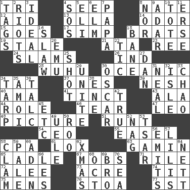 ACROSS 1. Three (prefix) 4. Ooze 8. Nathan's nickname 12. Assist 13. Water jar 14. Aroma 15. Leaves 17. Simple or foolish person 18. Naughty children 19. Lacking originality or spontaneity 21. _ moment's notice (2 wds.) 23. To separate or throw off 24. Shuts with force 26. Indiana (abbr.) 28. Chinese city south-southwest of Nanjing 30. Pertaining to the sea 34. Make lace 37. Washington bills 39. Tender 40. Housemaid (var.) 41. Colored lightly or faintly 43. According to 44. Hero or heavy, e.g. 46. Rend 47. Lion 48. Photo 51. Undersized animal 54. Corporate head (abbr.) 55. Artist's stand 58. Numbers guy (abbr.) 61. Brine-cured salmon 63. Homeless child 65. Dipping utensil 67. Disorderly crowds 71. Cause heat under the collar 72. Toward shelter 73. Measure of real estate 74. Teat (slang) 75. Not women's 76. Portico 77. Fast jet (abbr.) DOWN 1. Labels 2. Disturbances 3. Perfect 4. Mayday 5. Biblical high priest 6. Shade tree 7. Dad 8. Not either 9. The sixth month of the Jewish calendar 10. Lug 11. Celtic language 16. Cole _ (cabbage dish) 18. Object of repulsion 20. Australian flightless bird 22. Nervous spasm 25. Attempt 27. Daniel's nick name 29. Join together 30. Witty Wilde 31. Be tempered by heat 32. Small island 33. US Secretary of Labor Elaine L. _ 34. Canvas cover 35. Mine, in Marseilles 36. Baby powder 38. Compass dir. 42. Loyal 45. And so on (abbr.) 49. Ubangi River tributary 50. Friend of Pooh 52. Tired old horse 53. Russian ruler of old 56. Gives off 57. Ms. Damita and namesakes 58. Burrowing marine mollusk 59. Light colored 60. An important port of Yemen 62. Dec. holiday 64. Remaining after all deductions 66. French article 68. Sep. follower 69. Sis' sibling 70. Ocean