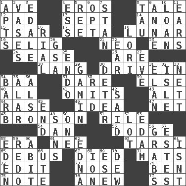 ACROSS 1. "___ Maria" 4. Greek god of love 8. Lie 12. Groovy apt. 13. Back-to-school mo. 14. Small Philippine buffalo 15. Russian ruler of old 17. Bristle 18. Type of eclipse 19. Former Milwaukee Brewers owner Bud 21. Modern: prefix 23. Followers of ems 24. Gospel singer Marvin 26. "We ___ not amused" (Victoria) 28. Long (Scottish) 30. Popular '50s hangout 34. Sound made by sheep 37. Have the gumption 39. Otherwise 40. Everything 41. Leaves out 43. Keyboard modifier key 44. Raze (variant) 46. It may be bright or harebrained 47. Fish or hair follower 48. "Death Wish" actor 51. Cause heat under the collar 54. One of the 12 tribes of Israel 55. Evade 58. Epoch 61. Born 63. Tarsus (plural) 65. To get out of a bus 67. Passed on 71. Floor protectors 72. Prepare for publication 73. Characteristic smell of wine 74. Benjamin's nick name 75. Musical sound 76. Afresh 77. Fast jet (abbr.) DOWN 1. Tenement units (abbr.) 2. Flower holders 3. Peak District village in England 4. Curvy letter 5. To sift 6. Choose 7. Comedian Laurel of Laurel & Hardy 8. The 19th letter of the Greek alphabet 9. Queen of England 1702-14 10. Grant temporary use of 11. Hearing organs 16. Monetary unit of Yemen 18. Australian parrot (variant) 20. Girls' org. (abbr.) 22. Ewer handle 25. Inside; within (prefix) 27. Night before a holiday 29. Homeless child 30. Prevent from occurring 31. Liveliness 32. Capri or Wright 33. Remaining after all deductions 34. Sharp remark 35. Having or resembling wings 36. In addition 38. To free from 42. Stated 45. Conclusion 49. Without 50. Single 52. Car dealer's back yard 53. Dutch treat 56. Takes hold of 57. _____ Park, CO 58. Genesis locale 59. Redecorate 60. "This won't hurt ____!" 62. Pulitzer Prize-winning author Ferber 64. Is not 66. Shoshoni 68. Electrically charged atom 69. Compass dir. 70. Morning condensation