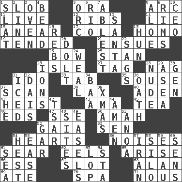 ACROSS 1. Messy guy 5. Mouth or opening 8. Curve 11. Not recorded 12. Teases 14. Whopper 15. Approach 17. Root beer relative 18. Like (prefix) 19. Watched over 21. Takes place subsequently 23. Ribbon knot 25. Comedian Laurel of Laurel & Hardy 26. Small island 27. Label 28. Tired old horse 31. Wedding promise 33. Bar bill 35. Boozer 37. Skim 38. Not strict 40. Arabian gulf 41. Robbery 43. Housemaid (var.) 45. Afternoon social gathering 46. Begley and Asner 47. Compass dir. 50. Housemaid 52. Greek goddess of the earth (variant) 53. Elected rep. 54. Centers 56. Annoying sounds 61. Wither 62. Snakelike fish 65. Originate 66. Double-curved letter 67. Narrow, elongated depression 68. ____ Jay Lerner 69. Had dinner 70. Health resort 71. Common sense DOWN 1. Narrow board 2. Actor's bit 3. Baking chamber 4. Necklace unit 5. The grampus (Milton) 6. _ de Janeiro 7. Most capable 8. Medicinal plant 9. Basketball hoops 10. Corporate head (abbr.) 13. Before Barbara or Clara 16. Confederate soldiers (slang) 18. Attila the _ 20. Stupid person 22. Sinks 24. Welt 26. Charged atoms 28. Naked 29. Toward the sea 30. Commissioned military rank (abbr.) 31. On the rocks 32. Raised platform 34. Sound made by sheep 36. Pledge 37. A female animal or person 39. Dec. holiday 42. Russian ruler of old 44. So be it 48. Locates 49. Artist's stands 51. Small Philippine buffalo 52. Slender fish 54. Behest 55. Comfort 57. SW Asia republic 58. Grain storage tower 59. Son of Isaac 60. Elected reps. 61. Ocean 63. Chop off 64. R.R. building