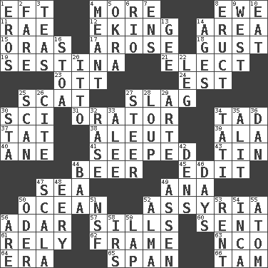 ACROSS 1. Bank Draft (abbr.) 4. Greater amount 8. She-sheep 11. Actress Charlotte 12. Supplementing with great effort 14. Type of rug 15. Mouths or openings 17. Came up 18. Abrupt rush of wind 19. French poetic form 21. Choose 23. Baseball player Mel 24. Eastern Standard Time (abbr.) 25. Go away! 27. Volcanic refuse 30. _-fi 31. Speaker 34. Small boy 37. Make lace 38. Native American of Southwest Alaska 39. In the manner of 40. A saturated hydrocarbon 41. Oozed 43. Metal container 44. Fermented drink made from hops 45. Prepare for publication 47. Ocean 49. Santa ___, CA 50. Sea 52. Nineveh was its capital 56. The sixth month of the Jewish calendar 57. Beverly of Met fame 60. Posted 61. Depend 62. Movie unit 63. Non-commissioned officer (abbr.) 64. Epoch 65. Connect, as a bridge 66. Scottish cap DOWN 1. Greek god of love 2. Conductor's collection 3. Beverages made from leaves 4. Intended 5. Gumbo ingredient 6. _ de Janeiro 7. Followers of ems 8. Spew [out] 9. Compass direction 10. Consume 13. Unit of force equal to gravity 14. Eras 16. Portico 20. "Tell ____ the Marines!" 22. Part of a journey 25. Skim 26. Quote 27. Bull 28. Central Nebraska county 29. Johnson of "Laugh-In" 30. R.R. building 32. To erase 33. Toward shelter 34. Jacques of French films 35. Set down 36. Daniel's nick name 42. Cub Scout units 44. Sound made by sheep 46. 24-hour periods 47. Any of the three canals of the cochlea 48. Suggestive of the supernatural 49. NE Netherlands city 50. Baltic tributary 51. Science/research agcy. 52. _ mater 53. Monthly bill 54. South American Indian 55. Tiny particle 56. "We ___ not amused" (Victoria) 58. Big collection agency 59. Infant locale