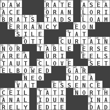 ACROSS 1. Obsolete 4. Assign a rank or rating to 8. Toward the sea 12. Adept person 13. Northwest Algerian city 14. Australian parrot (variant) 15. Naughty children 18. Bits 19. Rich soil 20. The state or an instance of erring 22. Period of immesurable duration 23. Filth; sediment 24. Make lace 25. Baseball player Mel 26. Window treatment 30. And not 33. Eating place 36. Celtic language 37. Type of rug 39. RI univ. 40. Snakelike fish 41. Strained 42. Garlic unit 44. Arrange properly for use 45. Shoved, as through a crowd 47. Slender fish 50. Modern: prefix 51. It may be bright or harebrained 53. Large container 54. Core 57. To provide with a ceiling 59. Jacques of French films 61. 0 degrees 63. Of or related to the anus 64. Goddess of spring and wife of Bragi 65. _ tizzy (2 wds.) 66. Have trust in 67. Singer Brickell 68. June honoree DOWN 1. Small moist lump or mass 2. Measure of real estate 3. Puts on (as clothing) 4. College mil. group 5. Like ___ of sunshine 6. Small amount or degree 7. Followers of ems 8. One to whom something is allotted 9. Within a short period 10. Period 11. Direct toward a target or goal 16. Musical group of three 17. Table seasoning 21. Remaining after all deductions 22. Ewer handle 24. Third day of the wk. 26. 154 in Roman numerals 27. Ancient Greek god of war 28. Small island 29. Egg locale 30. Nathan's nickname 31. Taken by mouth 32. Reuben's nickname 34. Old (Scot.) 35. Sis' sibling 38. Lacking a tonal center or key 42. Corporate head (abbr.) 43. The front part of a cuirass 46. Dripping 48. An important port of Yemen 49. Former U.S. Attorney General Janet 52. Sour-tasting 53. Small bottle 54. Needle case 55. Trig term 56. Inactive volcano in Sicily 57. Automobile 58. Compass dir. 59. Make a knot 60. Find the sum of 62. Possessed