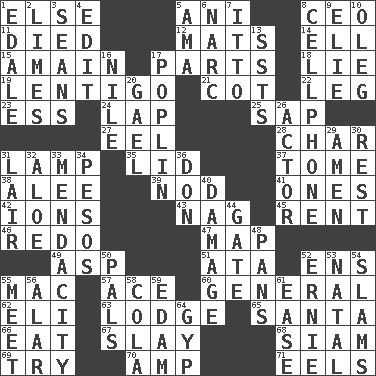 ACROSS 1. Otherwise 5. Cuckoo 8. Corporate head (abbr.) 11. Passed on 12. Floor protectors 14. Pipe bend 15. At full speed 17. Pieces 18. Whopper 19. Small, flat, pigmented spot on the skin 21. Small bed 22. Part of a journey 23. Curvy letter 24. Infant locale 25. Plant excrement 27. Snakelike fish 28. Burn to charcoal 31. Desk light 35. Hat (slang) 37. Heavy book 38. Toward shelter 39. Allow head to fall sleepily 41. Washington bills 42. Charged particles 43. Tired old horse 45. Monthly bill 46. Do over again 47. Atlas unit 49. Viper 51. "One Day ___ Time" 52. Followers of ems 55. Apple computer (short form) 57. Adept person 60. Commissioned military rank 62. Biblical high priest 63. Cabin 65. Before Barbara or Clara 66. Ingest 67. Kill 68. Thailand, formerly 69. Attempt 70. Electrical Unit 71. Snakelike fish DOWN 1. Peak District village in England 2. Citrus fruits 3. Actors Connery and Penn 4. Prepare for publication 5. Nanny (var.) 6. Drug cop 7. "Tell ____ the Marines!" 8. Portable communications device 9. Writer Wiesel 10. Cassini of fashion 13. Fast planes 16. "Death on the ____" 17. Cotton for raincoats, e.g. 20. Highlander 26. Thespian 29. So be it 30. Take ten 31. Den 32. _ vera 33. Ananias' fault 34. Mexican monetary units 36. Spanish title 40. Break 44. Yard entry 48. Zero-star reviews 50. Friends 52. Bert's buddy 53. Brizilian seaport 54. Criticizes harshly 55. Rendezvous 56. Having or resembling wings 58. Root beer relative 59. Dutch treat 61. Comfort 64. Swindle