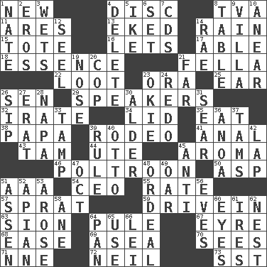 ACROSS 1. ___ Haven, CT 4. Plate 8. Federal power corp. 11. Ancient Greek god of war 13. Made supply last 14. Water falling in drops from the sky 15. Carryall 16. Allows 17. Competent 18. Substance 21. Chap (slang) 22. Spoils 23. Mouth or opening 25. Hearing organ 26. Elected rep. 29. Orators 32. Feeling or showing extreme anger 34. Hat (slang) 35. Erode 38. Dad 39. Cowboy competition 41. Of or related to the anus 43. Scottish cap 44. Shoshoni 45. Odor 46. Coward 50. Viper 51. Auto club (abbr.) 54. Corporate head (abbr.) 55. Pace 57. Small fatty European fish 59. Popular '50s hangout 63. The Jewish people; Israel 64. Whimper 67. Jane of fiction 68. Relaxation 69. At sea 70. Perceives with the eye 71. Compass dir. 72. Famous astronaut Armstrong 73. Fast jet (abbr.) DOWN 1. Nathan's nickname 2. Greek god of love 3. Soaks 4. Keyboard key 5. D.D.E's nickname 6. Arrange properly for use 7. Music discs 8. Eating place 9. Country residence 10. Approach 12. Sew up the eyelids of hawks and falcons 14. Actress Charlotte 19. Sense of smell 20. Police officer (slang) 21. Distant 23. Migrant worker of the '30s 24. Make new 26. Small drink 27. Part of Q.E.F. 28. California wine valley 30. Tree or shrub in the Birch family 31. Wither 33. Pack (down) 36. Small Philippine buffalo 37. Scottish caps 39. General guideline 40. Von Bismarck 42. Infant locale 45. Against 47. Sep. follower 48. Severe or trying experience 49. Rowing implement 51. NE Netherlands city 52. Bee-related 53. Came up 56. Nights before holidays 58. A saturated hydrocarbon 60. Snake ____ (dice throw) 61. Angers 62. Egg locale 64. Baking dish 65. Purpose 66. Luau accessory