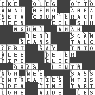 ACROSS 1. Supplement with great effort 4. Cassini of fashion 8. "Beetle Bailey" pooch 12. Of or related to the anus 14. San ____ (Riviera town) 15. Length times width 16. Stalk of a moss capsule 17. Neutralize 20. Adolescent 21. Snakelike fish 22. Quiet! 23. Group of southern Bantu languages 27. Nursemaid 29. Portable shelter 31. Examine hastily 34. Actors Connery and Penn 35. Baby powder 36. Foregone conclusion 39. Declare 41. To the inside or interior of 42. Toward shelter 43. Prevent from occurring 46. Corncob 47. Writer Wiesel 48. Mouths or openings 51. Soviet premier 1918-24 54. And not 56. Born 58. Backtalk 61. Pleas 66. Nuclear Threat Initiatives 67. It may be bright or harebrained 68. Prong on a fork 69. Small pie 70. Old wives' tales, e.g. 71. Helper 72. French article DOWN 1. Compass direction 2. Leg joint 3. Ingested 4. The grampus (Milton) 5. Lion 6. Australian flightless bird 7. Went 8. Boat paddle 9. File 13 10. Georgia ____ (Atlanta school) 11. Pledge 13. Austrian-born American filmmaker Fritz 18. Afternoon social gathering 19. Shade tree 24. Shoshoni 25. Teachers' org. 26. Restaurants 28. Moving or stirring 30. Sadhe (variant) 32. The first octave above the treble staff 33. Non-commissioned officer (abbr.) 34. Bull 36. Head covering 37. Connecticut Ivy Leaguer 38. News announcer 40. Shout 44. Neckwear 45. Car or cant ending 49. A saturated hydrocarbon 50. Ocean 52. Is not 53. Relating to or accompanying birth 54. Famous astronaut Armstrong 55. Southwest Nigerian state 57. Singer James 59. Male parent of an animal 60. Fast planes 62. Actress Charlotte 63. One more than two 64. Conclude 65. Perceive with the eye