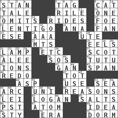 ACROSS 1. Comedian Laurel of Laurel & Hardy 5. Label 8. Domesticated feline 11. Falsehood 12. Cause heat under the collar 14. Single 15. Leaves out 17. Amusement-park features 18. Enemy 19. Small, flat, pigmented spot on the skin 21. Santa ___, CA 22. Air blower 23. Compass dir. 24. Auto club (abbr.) 25. Shoshoni 27. Mountains (abbr.) 28. Snakelike fish 31. Desk light 35. And so on (abbr.) 37. Native of Scotland 38. Toward shelter 39. Distress signal 41. Ballerina skirt 42. Charged atoms 43. Separate the seeds from cotton 45. Connect, as a bridge 46. Redecorate 47. Small child 49. Viper 51. Purpose 52. Ocean 55. Curve 57. University (slang) 60. Thinks logically 62. Flowery wreath 63. Utah city north of Ogden 65. Table seasonings 66. Pacific Standard Time (abbr.) 67. Smallest unit of an element 68. It may be bright or harebrained 69. Filthy place 70. Period 71. Dormintory (informal) DOWN 1. Took without asking 2. Corrects by punishment or discipline 3. Place in a line 4. Remaining after all deductions 5. Three (prefix) 6. Opera by Verdi 7. Small, secluded valley 8. Java holder (2 wds.) 9. Small Philippine buffalo 10. Adolescent 13. He sold his birthright 16. Thailand, formerly 17. Cooks with dry heat, as in an oven 20. Yard entry 26. Trials 29. Globular water bottle used in Asia 30. Make senseless or dizzy 31. Den 32. _ vera 33. Ananias' fault 34. Mexican monetary units 36. Gear tooth 40. Titan orbits this 44. Sense of smell 48. Beverages made from leaves 50. Monetary unit of Botswana 52. Twentieth part of a lira 53. Keyboard key 54. Indian state 55. High mountains 56. Repose 58. Observe 59. Composer Stravinsky 61. Expressed in words 64. Wet nurse (var.)