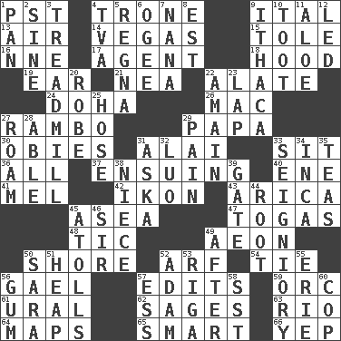 ACROSS 1. Pacific Standard Time (abbr.) 4. Heavy duty weighing machine 9. Slanted text style (abbr.) 13. Atmosphere 14. Viva Las _ 15. Lacquered or enameled metalware 16. Compass dir. 17. Representative 18. Parka part 19. Hearing organ 21. Teachers' org. 22. Having winglike extensions 24. Capital of the state of Qatar 26. Big _ 27. Role for Stallone 29. Dad 30. Off-Broadway awards 31. Jai _ 33. Be seated 36. 100% 37. Following as a consequence or result 40. Compass dir. 41. Cartoonist voice _ Blanc 42. Picture 43. N. Chile seaport 45. At sea 47. Ancient Roman robes 48. Nervous spasm 49. Period of immesurable duration 50. Dinah or Pauly 52. Sandy's bark 54. Make a knot 56. Highlander 57. Prepares for publication 59. The grampus (Milton) 61. Mountain range 62. Gurus 63. River (Sp.) 64. Atlas contents 65. Don Adams' spy role 66. Slangy assent DOWN 1. Baking dish 2. Trig term 3. Excercise machine 4. Federal power corp. 5. Canadian anthropologist Darnell 6. Double curve, resembling the letter S 7. Grandmother 8. Eastern Standard Time (abbr.) 9. New York city 10. A blast of a horn 11. Medicinal plant 12. Directed 20. Loose flowing garment 22. At full speed 23. Pet locale 25. Stockings 27. Wander aimlessly 28. Competent 29. Ache 31. "____ silly question..." 32. Nilotic language 33. Signiory (variant) 34. South American Indian 35. Afternoon social gatherings 38. Sibling's daughter 39. Yard entry 44. Carrot, for example 45. Ringlike coral islands and reefs 46. Title for a knight 49. Following 50. "Two Mules for Sister ____" 51. Pile 52. First man 53. Capital of Latvia 55. 4th largest of the Great Lakes 56. Chewing product 57. Double-curved letter 58. Fast jet (abbr.) 60. Police officer (slang)