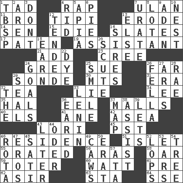 ACROSS 1. Small boy 4. Strike 7. ____ Bator 11. Sis' sibling 12. Native american tent (variation) 13. Wear away 14. Elected rep. 15. Singer Brickell 16. Chalkboards 17. Eucharist need 19. Helper 21. Find the sum of 23. Algonquian 24. Jennifer or Joel 25. Take to court 26. Distant 29. Message 30. Mountains (abbr.) 31. Period 32. Afternoon social gathering 33. Whopper 34. Area sheltered from the wind 35. Actor Linden 36. Snakelike fish 37. Promenades 40. Raised railways 41. One (Scot) 42. Toward the sea 43. Australian parrot (variant) 45. Pacific Standard Time (abbr.) 46. Home 51. Small island 55. Declaimed 56. Ancient river in northeast Turkey 58. Boat paddle 59. Carrier 60. Electrical Unit 61. Before (prefix) 62. SW Saudi Arabia district 63. R.R. building 64. Compass dir. DOWN 1. Cook's measure (abbr.) 2. Length times width 3. Do not 4. To free from 5. Capital of Western Samoa 6. Sliced desserts 7. A salt of uric acid 8. Globular water bottle used in Asia 9. Arabian gulf 10. A home for chicks 12. Looked after 13. Otherwise 16. Titles for men of rank and authority 18. Merit 20. Turtle shell scale 22. Color 24. Purposes of endeavors 25. Grin 26. Chap (slang) 27. Ancient Greek god of war 28. Actress Charlotte 29. Lick closed 32. Definite Article 33. Soviet premier 1918-24 36. Having ears or earlike features 37. Atlas unit 38. Aid 39. Allows 43. 61 cubic inches 44. Baltic tributary 46. Roll call or roster of names 47. Greek god of love 48. Suttee (variant) 49. Crow sounds 50. Part of Q.E.F. 52. Chops off 53. Hearing organs 54. Family _ (genealogy) 57. "One Day ___ Time"