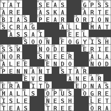 ACROSS 1. Make lace 4. Oceans 8. Global Positioning Systems (abbr.) 12. "We ___ not amused" (Victoria) 13. "____ silly question..." 14. Johnson of "Laugh-In" 15. Prejudice 17. Lightbulb-shaped fruit 18. Greek mythologigal hunter 19. Strangle with an iron collar 21. 100% 23. Floor protector 24. Slender Brazilian palm 26. Snakelike fish 28. Within a short period 30. Out of fashion; old fashioned 34. Compass dir. 37. Connecting point 39. One of the Great Lakes 40. Or not 41. Contemptuous expression 43. According to 44. Toward shelter 46. Inside; within (prefix) 47. Lower and raise head in agreement 48. Pre-World Series prize 51. Play the lead 54. First lady 55. Approach 58. Period 61. It would 63. Ferber et al. 65. Promenades 67. Musical composition 71. Legendary monster 72. Small island 73. Delicate 74. Allow 75. Afternoon social gatherings 76. Relationship diagram 77. Mouth or opening DOWN 1. Bar bills 2. N. Chile seaport 3. Pulls into pieces 4. Plant excrement 5. Compass dir. 6. Alias (abbr.) 7. "Two Mules for Sister ____" 8. Slender fish 9. Demure 10. Portico 11. Posted 16. Backtalk 18. Cassini of fashion 20. E Mali city 22. Lion 25. Charged atoms 27. Potassium hydroxide 29. Music written for nine 30. Eats 31. SW Asia republic 32. Grain storage tower 33. Froth on beer 34. Fastener 35. Not divided or shared with others 36. Songbird 38. Lair 42. Round or rotation of duties 45. Compass dir. 49. Advice 50. Fish or hair follower 52. One (Scot) 53. Do over again 56. White American of non-Hispanic descent 57. More valued for its uncommonness 58. Send forth 59. Raze (variant) 60. Silent film actress Nazimova 62. Do not 64. Stalk of a moss capsule 66. French article 68. For each 69. Purpose 70. A female animal or person