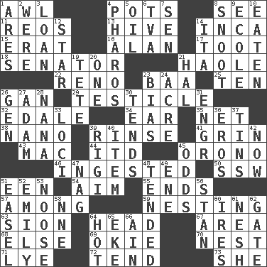 ACROSS 1. Leather borer 4. Cooking vessels 8. Perceive with the eye 11. Vintage cars 13. Hub of activity 14. South American Indian 15. Part of Q.E.F. 16. ____ Jay Lerner 17. A blast of a horn 18. Elected representative 21. White Person, in Hawaii 22. Former U.S. Attorney General Janet 23. Sound made by sheep 25. "___ Little Indians" 26. Separate the seeds from cotton 29. One of the two male reproductive glands 32. Peak District village in England 34. Hearing organ 35. Fish or hair follower 38. Billionth: prefix 39. Remove soap 41. Amused look 43. Apple computer (short form) 44. It would 45. U. of Maine site 46. Swallowed 50. Compass dir. 51. Car or cant ending 54. Direct toward a target or goal 55. Conclusions 57. Amid 59. Inhabiting a nest 63. The Jewish people; Israel 64. Froth on beer 67. Length times width 68. Otherwise 69. Migrant worker of the '30s 70. A home for chicks 71. Potassium hydroxide 72. Watch over 73. A female animal or person DOWN 1. Ancient Greek god of war 2. We are 3. Grant temporary use of 4. N Egypt peninsula 5. Lubricate 6. Federal power corp. 7. Elected rep. 8. Snout, nose 9. Learning spot: Fr. 10. Eroded 12. Play the lead 14. Call ___ day 19. False hair 20. Single 21. Actor Linden 23. Prejudice 24. Land measure 26. Commissioned mil. rank 27. First man 28. Grandmother 30. Watches over 31. Engineer (abbr.) 33. Venues 36. Greek god of love 37. Canisters 39. Swiss mountan, "Queen of the Mountains" 40. Detail 42. Immediately 45. Probability 47. Tired old horse 48. Watched over 49. Compass dir. 51. Artist's stand 52. Poet Dickinson 53. Trap for birds or small mammals 56. Comedian Laurel of Laurel & Hardy 58. Compass dir. 60. Angers 61. Soft 62. Yard entry 64. Being at a high temperature 65. Make supply last 66. The 18th letter of the Arabic alphabet