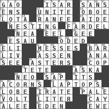 ACROSS 1. E Mali city 4. Austrian river, tributary to the Danube 8. Without 12. Followers of ems 13. Join together 14. Mitch Miller's instrument 15. Globular water bottle used in Asia 17. The wife of a rajah (variant) 18. Assistant 19. Inhabiting a nest 21. Pack 23. Teachers' org. 24. Snakelike fish 26. Unit of force equal to gravity 27. He sold his birthright 28. Wrote a lyric poem 30. Connecticut Ivy Leaguer 31. Makes clutter 34. Oblong piece of solid material 37. 54 in ancient Rome 38. NE Netherlands city 39. Santa ___, CA 40. Observe 41. Michaelmas daisies 42. Police officer (slang) 43. False hair 44. "____ silly question..." 46. Modern: prefix 47. Plant excrement 50. It is 51. Oak nuts 54. Portable computers 57. Ear part 58. Feeling or showing extreme anger 60. Diluted with white 62. Electrical Unit 63. 61 cubic inches 64. Island 65. Toward shelter 66. Paradise 67. She-sheep DOWN 1. Set 2. Soon (poet.) 3. Clearly or manifestly demonstrative 4. Lacking in sense or substance 5. Burn superficially 6. Had dinner 7. Coral collection 8. Flew 9. Stay 10. Thickened enlargement 11. Sew up the eyelids of hawks and falcons 13. RI univ. 16. Toward the sea 20. The 19th letter of the Greek alphabet 22. Grows older 25. Failure 27. Writer Wiesel 29. Hiding places for outlaws 30. Raised railways 31. Vertical spar for supporting sails 32. _____ Park, CO 33. Compass dir. 34. Keyboard key 35. Small Philippine buffalo 36. Strike 41. Period of immesurable duration 43. Cylindrical with tapered ends 44. Small island 45. Obstruct or block passage 46. Having high moral qualities 48. Having winglike extensions 49. Eucharist need 51. Inventor's middle name 52. Calm and collected 53. Filth; sediment 55. For each 56. Cole _ (cabbage dish) 59. To free from 61. Sight organ