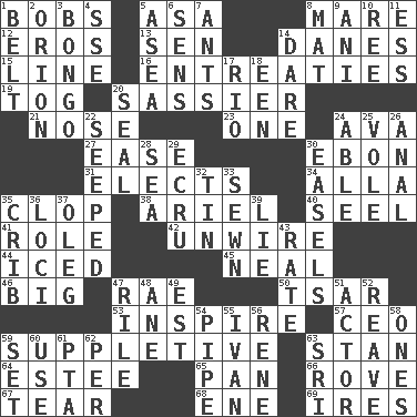 ACROSS 1. Moves up and down 5. White ___ sheet 8. Female horse 12. Greek god of love 13. Elected rep. 14. Natives or inhabitants of Denmark 15. Actor's bit 16. Pleas 19. Coat; cloak 20. More lively and spirited 21. Olfactory organ 23. Single 24. Actress Gardner 27. Comfort 30. Inky black, to poets 31. Chooses 34. Silent film actress Nazimova 35. Hoof sound 38. Satellite of Uranus 40. Stitch closed the eyes of (a falcon) 41. Hero or heavy, e.g. 42. Undo the wiring of 44. On the rocks 45. Actress Patricia 46. Large 47. Actress Charlotte 50. Russian ruler of old 53. Heighten or intensify 57. Corporate head (abbr.) 59. Supplementary 63. Comedian Laurel of Laurel & Hardy 64. First name in cosmetics 65. Baking dish 66. Be footloose 67. Separate forcefully 68. Compass dir. 69. Angers DOWN 1. Waist strap 2. Constellation of myth 3. Beat drum 4. Compass dir. 5. At sea 6. Elected reps. 7. Pismires 8. Floor covering 9. Cuckoo 10. Portuguese money of account (variant) 11. Curvy letter 14. Have the gumption 17. _ de Janeiro 18. Car or cant ending 20. Lick closed 22. Oozed 24. Competent 25. Grand slam 26. Of or related to the anus 28. Ocean 29. Shade of tan 30. Artist's stands 32. Metal container 33. Stitched 35. Baby bed with high sides 36. Locales 37. Cassini of fashion 39. Untruth 43. Pace 47. Cause heat under the collar 48. A saturated hydrocarbon 49. Eastern Standard Time (abbr.) 51. Thespian 52. Break or tear apart 54. Corncob 55. _ the terrible 56. French philosopher Descartes 58. Washington bills 59. Arrange properly for use 60. Purpose 61. Parent Teacher Association (abbr.) 62. For each 63. Indian title of respect (Mr.)