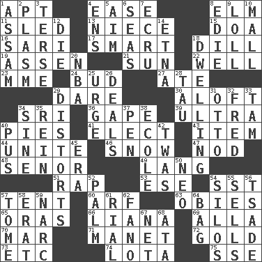 ACROSS 1. Fitting 4. Relaxation 8. Shade tree 11. Downhill vehicle 13. Sibling's daughter 15. ___ good deed 16. Indian skirt 17. Don Adams' spy role 18. Deli pickle 19. NE Netherlands city 21. Player for Phoenix 22. Not ill 23. Madame (abbr.) 24. Partially opened flower 27. Had dinner 29. Have the gumption 30. High up in or into the air 34. Indian title of respect (Mr.) 36. Open wide 39. Extreme 40. Sliced desserts 41. Choose 43. A distinct part 44. Join together 46. Overwhelm 47. Dreamland 48. Sir (Sp.) 49. Austrian-born American filmmaker Fritz 51. Reproach for some lapse or misdeed 53. Compass dir. 54. Fast jet (abbr.) 57. Portable shelter 60. Sandy's bark 63. Off-Broadway awards 65. Mouths or openings 66. Climbing, woody, usually tropical vines 69. Silent film actress Nazimova 70. Make imperfect 71. French painter Edouard 72. Aureate 73. And so on (abbr.) 74. Globular water bottle used in Asia 75. Compass dir. DOWN 1. Indian state 2. Suffix with ecto or cyto 3. Laconic 4. Followers of ems 5. Direct toward a target or goal 6. Oceans 7. Shade of tan 8. Singer Brickell 9. Hang loosely or laxly 10. Promenade 12. Pass on 14. Inactive volcano in Sicily 18. Residence 20. Basketball assoc. 25. Goad 26. Allots cards 28. The 19th letter of the Greek alphabet 29. What propaganda does 31. Von Bismarck 32. Flintstone 33. Scottish cap 34. Trig term 35. It's straight from the horse's mouth 37. Animal enclosure 38. Learning spot: Fr. 40. Fluid product of inflammation 42. It was, poetically 45. Epoch 50. Modern: prefix 52. Inside of hand 54. Grain storage towers 55. Makes a sale 56. Sadhe (variant) 57. Heavy book 58. Part of Q.E.F. 59. Drug cop 61. Monetary unit of Yemen 62. Papal veil 64. Container for groceries 67. Fish or hair follower 68. "One Day ___ Time"