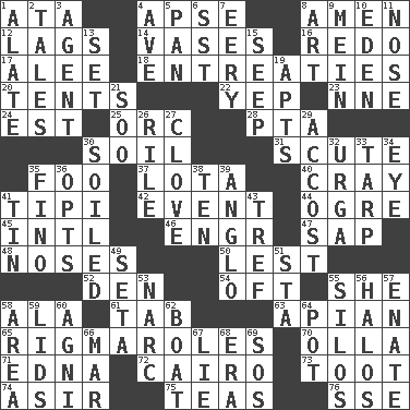 ACROSS 1. "One Day ___ Time" 4. Domed church section 8. So be it 12. Fails to keep up a pace 14. Flower holders 16. Make new 17. Toward shelter 18. Pleas 20. Portable shelters 22. Slangy assent 23. Compass dir. 24. Eastern Standard Time (abbr.) 25. The grampus (Milton) 28. Parent Teacher Assoc. 30. The visible part of the earth's surface 31. Snake scale 35. Egg _ yung 37. Globular water bottle used in Asia 40. Supercomputer manufacturer 41. Native american tent (variation) 42. Incident 44. Legendary monster 45. International (abbr.) 46. Engineer (abbr.) 47. Plant excrement 48. Olfactory organs 50. For fear that 52. Lair 54. Often (poetically) 55. A female animal or person 58. Wing 61. Bar bill 63. Bee-related 65. Complicated, petty procedures 70. Spanish pot 71. Pulitzer Prize-winning author Ferber 72. Capital of Egypt 73. A blast of a horn 74. SW Saudi Arabia district 75. Afternoon social gatherings 76. Compass dir. DOWN 1. Having winglike extensions 2. Falsehoods 3. Rep 4. "___ Maria" 5. Baking dish 6. Fast jet (abbr.) 7. Suggestive of the supernatural 8. Tate display 9. Count _ (2 wds.) 10. Locale of original sin 11. Sense of smell 13. Put into a specified state 15. Ooze 19. Flats, for short 21. "Barney Miller" actor Jack 26. Cause heat under the collar 27. Garlic unit 29. Buttonhole 30. Dirtied 32. Capital and largest city of Mongolia 33. Canvas cover 34. Sight organ 35. Fine (Spanish) 36. Elects 38. "___ Little Indians" 39. White American of non-Hispanic descent 41. Metal container 43. Not kosher 49. Bristle 51. R.R. building 53. Drug cop 55. Grain storage towers 56. Radiant circles of light 57. Related on the mother's side 58. Type of rug 59. Hats (slang) 60. Hindu god of fire 62. Water vessel 64. Cooking vessel 66. Third mo. 67. Untruth 68. Period 69. Mayday