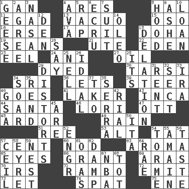 ACROSS 1. Separate the seeds from cotton 4. Ancient Greek god of war 8. Actor Linden 11. Mild oath 13. In a vacuum (with "in") 15. Bear (Spanish) 16. Celtic language 17. Showery time 18. Capital of the state of Qatar 19. Actors Connery and Penn 21. Shoshoni 22. Genesis locale 23. Snakelike fish 24. Cuckoo 27. Lubricate 29. Colored 30. Tarsus (plural) 34. Indian title of respect (Mr.) 36. Allows 39. Navigate 40. Moves 41. Member of a famous L.A. basketball team 43. South American Indian 44. Before Barbara or Clara 46. Australian parrot (variant) 47. Baseball player Mel 48. Zeal 49. Water falling in drops from the sky 51. To sift 53. The first octave above the treble staff 54. Make lace 57. Penny 60. Allow head to fall sleepily 63. Scent 65. Sight organs 66. Let have 69. Ancient river in northeast Turkey 70. Big collection agency 71. Role for Stallone 72. Give off 73. Allow 74. Petty quarrel 75. Compass dir. DOWN 1. Honkers 2. Match 3. Rhinal 4. Actress Gardner 5. Reproach for some lapse or misdeed 6. Shade of tan 7. Costume for a special activity 8. Parka part 9. American tennis player Robert 10. Grant temporary use of 12. Lair 14. Margarine 18. Accusation by an informer 20. Declare 25. 1994 drama film starring Jodie Foster 26. Standard of perfection 28. It is 29. What propaganda does 31. Monthly bill 32. Religious group 33. Lyricist Gershwin 34. Fly high 35. Tear apart 37. Ring climax 38. Father Junipero _ 40. Girls' org. (abbr.) 42. Monetary unit of Yemen 45. "We ___ not amused" (Victoria) 50. Call ___ day 52. Engineer (abbr.) 54. Singer Mel 55. With great haste 56. Clothes sense 57. To provide with a ceiling 58. Jane of fiction 59. Egg locale 61. Mouths or openings 62. Moist 64. Actress Charlotte 67. Basketball assoc. 68. Small child