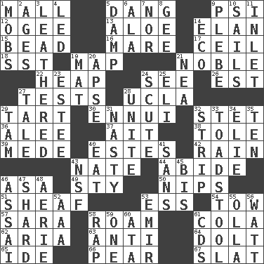 ACROSS 1. Promenade 5. Mild oath, euphamism for damn 9. Air pressure measure (abbr.) 12. Double curve, resembling the letter S 13. _ vera 14. Flair 15. Necklace unit 16. Female horse 17. To provide with a ceiling 18. Fast jet (abbr.) 19. Atlas unit 21. Impressive in appearance 22. Pile 24. Observe 26. Eastern Standard Time (abbr.) 27. Trials 28. Southern CA. univ. 29. Small pie 30. World-weariness 32. Proofreading order 36. Toward shelter 37. Small island 38. Lacquered or enameled metalware 39. Ancient Persian 40. _____ Park, CO 42. Precipitation 43. Nathan's nickname 44. Stay 46. White ___ sheet 49. Filthy place 50. Cuts off 51. To gather and bind into a bundle 53. Curvy letter 54. Pull behind 57. "Two Mules for Sister ____" 58. Wander aimlessly 61. Root beer relative 62. Roberta Peters solo 63. Opposed to 64. Dunce 65. Binary compound 66. Lightbulb-shaped fruit 67. Narrow board DOWN 1. Disorderly crowds 2. Ripens 3. Tough but pliablecoriaceous 4. Directed 5. Moist 6. According to 7. Or not 8. Turn to the right 9. First-year military academy student 10. Moves on water 11. An arm off of a larger body of water 14. Environmental prefix 19. Floor covering 20. Domed church section 21. Teachers' org. 23. First name in cosmetics 24. Turtle shell scale 25. Biblical high priest 27. Lie 28. Join together 29. Scottish cap 31. Difficult 32. Long narrow piece of something 33. Inedible or poisonous agaric 34. Writer Wiesel 35. Nine, plus one 40. Ingest 41. Without 43. Overdraft (abbr.) 45. Twice 46. Slender Brazilian palm 47. Broken piece 48. Nest on high 52. Auto club (abbr.) 53. Independent ruler or chieftain 55. Rounded earthenware pot or jar 56. Electrical Unit 58. Reproach for some lapse or misdeed 59. Single 60. _ moment's notice (2 wds.) 61. Music discs