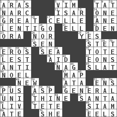 ACROSS 1. Caspian sea tributary 5. Zeal 8. Make lace 11. Drug cop 12. Austrian river, tributary to the Danube 14. Single 15. Relatively large 17. Cell (Danish) 18. One (Scot) 19. Small, flat, pigmented spot on the skin 21. Pipe bend 22. Lair 23. Mouth or opening 24. And not 25. Affirmative reply 27. Elected rep. 28. Proofreading order 31. Greek god of love 35. Ocean 37. Carry 38. For fear that 39. Assist 41. Immeasurably long periods of time 42. Opposed to 43. Tired old horse 45. Narrow board 46. Christmas carol 47. Atlas unit 49. ___ Haven, CT 51. _ moment's notice (2 wds.) 52. Followers of ems 55. Suppuration 57. Cleo's killer 60. Commissioned military rank 62. Corn or form start 63. One or ones belonging to thee 65. Before Barbara or Clara 66. 54 in ancient Rome 67. False hair 68. Thailand, formerly 69. Had dinner 70. A female animal or person 71. Snakelike fish DOWN 1. White American of non-Hispanic descent 2. More uncommon 3. Sports stadium 4. Scram! 5. Compete 6. Capri or Wright 7. Shopping center 8. Inedible or poisonous agaric 9. Queen of England 1702-14 10. Adolescent 13. Have trust in 16. Metal containers 17. Pupil covering 20. Moves 26. _____ Park, CO 29. Inactive volcano in Sicily 30. Trial 31. Flair 32. Western Nevada city 33. Clearly or manifestly demonstrative 34. Vertical member of a panel or frame 36. The 18th letter of the Arabic alphabet 40. Break 44. Yard entry 48. Zero-star reviews 50. Electrical Unit 52. Bert's buddy 53. Relating to or accompanying birth 54. Hits or strikes with great force 55. Monetary unit of Botswana 56. A single undivided whole 58. "______ My Girl" (Turtles hit) 59. Heart or essence 61. Relaxation 64. Born