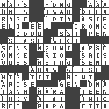 ACROSS 1. Armed conflicts 5. Like (prefix) 9. Auto club (abbr.) 12. Singles 13. Austrian river, tributary to the Danube 14. Spanish pot 15. To erase 16. Globular water bottle used in Asia 17. SW Saudi Arabia district 18. Biblical high priest 19. Snakelike fish 21. U. of Maine site 22. Texas town _ City 24. Fast jet (abbr.) 26. Animal enclosure 27. Gospel singer Marvin 28. Religious group 29. Elected reps. 30. Group of southern Bantu languages 32. Domed church section 36. Single time 37. _ de Janeiro 38. Indian titles of respect 39. Lyric poems 40. Paris' subway 42. Emitted 43. Ancient river in northeast Turkey 44. Honkers 46. Mountains (abbr.) 49. Teat (slang) 50. Painter Guido (1575-1642) 51. Came up 53. Commissioned mil. rank 54. Heredity factor (abbr.) 57. Hyperbolic tangent 58. Hindu Mythology: god of death 61. Adolescent 62. Whirlpool 63. Jai ____ 64. To the inside or interior of 65. To separate or throw off 66. Dad 67. Singer James DOWN 1. Had on 2. Of or related to the anus 3. Home 4. Compass dir. 5. Land elevation 6. Bear (Spanish) 7. Floor protector 8. Mouth or opening 9. Columnist Joseph or Stewart 10. Place in a line 11. Composer Copland 14. Boat paddle 19. Begley and Asner 20. Genesis locale 21. Baseball player Mel 23. Fertile tracts in a desert 24. Sir (Sp.) 25. _-fi 27. Post 28. Costumes for special activities 29. "Barney Miller" actor Jack 31. Relatively large 32. NE Netherlands city 33. Elected leader of a country 34. Trig term 35. Eastern Standard Time (abbr.) 40. Medical imaging device (abbr.) 41. Legendary monster 43. Had dinner 45. Car or cant ending 46. Mother 47. Swap 48. Message 52. Like a shrinking violet 53. Greek goddess of the earth (variant) 55. Remaining after all deductions 56. Small Philippine buffalo 58. Atlas unit 59. Wing 60. Hit sharply and swiftly 61. Make a knot
