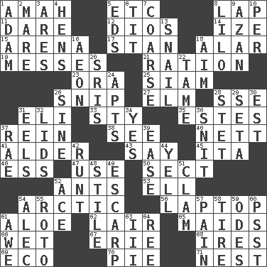 ACROSS 1. Nanny 5. And so on (abbr.) 8. Infant locale 11. Have the gumption 12. "Vaya con ____" 14. Ending with capital 15. Sports stadium 17. Comedian Laurel of Laurel & Hardy 18. Having or resembling wings 19. Makes clutter 21. Food allowance for one day 23. Mouth or opening 25. Thailand, formerly 26. Sever or remove by pinching or nipping 27. Shade tree 28. Compass dir. 31. Connecticut Ivy Leaguer 33. Filthy place 35. _____ Park, CO 37. It's straight from the horse's mouth 38. Observe 40. Remaining after all deductions 41. Tree or shrub in the Birch family 43. Declare 45. Call ___ day 46. Double-curved letter 47. Purpose 50. Religious group 52. Pismires 53. Pipe bend 54. Northern region 56. Portable computer 61. _ vera 62. Den 65. Women servants 66. Dripping 67. 4th largest of the Great Lakes 68. Angers 69. Environmental prefix 70. Sliced dessert 71. Egg locale DOWN 1. First man 2. Female horse 3. Ancient Greek god of war 4. Coop moms 5. Begley and Asner 6. Teat (slang) 7. Rough 8. _ and Stitch 9. Muslim summons to prayer 10. For each 13. Slow-paced one 16. A really long time 18. Direct toward a target or goal 20. Indian titles of respect 22. Not wild 24. Tenement units (abbr.) 26. Trig term 28. Proofreading order 29. Bristle 30. Eastern Standard Time (abbr.) 31. Snakelike fish 32. Hats (slang) 34. Consenting reply 36. In a ____ (agitated or irritated) 37. Actress Charlotte 39. Relaxation 42. Undersized animal 44. Shout 48. Vertical member of a panel or frame 49. Fortification 51. Burrowing marine mollusk 52. Adept person 54. Actor Baldwin 55. Printing process, for short 57. Ache 58. Hoop that covers a wheel 59. Lyric poems 60. Inconspicuous attention getter 61. Deep reverence 63. One more than two 64. To separate or throw off