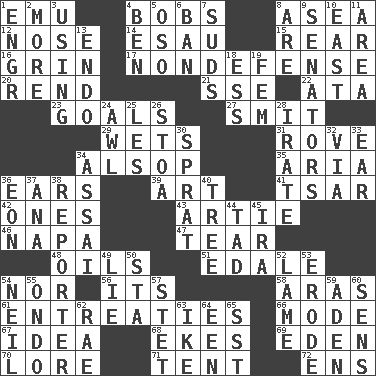 ACROSS 1. Australian flightless bird 4. Moves up and down 8. Toward the sea 12. Characteristic smell of wine 14. Son of Isaac 15. Tail end 16. Amused look 17. Unrelated to defense, as in spending 20. Tear apart 21. Compass dir. 22. "One Day ___ Time" 23. Scores awarded for successful feats 27. Stricken, poetically 29. Moistens 31. Be footloose 34. Columnist Joseph or Stewart 35. Operatic vocal solo 36. Hearing organs 39. Tate display 41. Russian ruler of old 42. Singles 43. Nick name for Arthur 46. California wine valley 47. Pull into pieces 48. Lubricates 51. Peak District village in England 54. Or not 56. It is 58. Ancient river in northeast Turkey 61. Pleas 66. Method 67. The main thing one is thinking about 68. Supplements with great effort 69. Paradise 70. Old wives' tales, e.g. 71. Portable shelter 72. Followers of ems DOWN 1. Engineer (abbr.) 2. Greater amount 3. Exploiting 4. Benjamin's nick name 5. Bear (Spanish) 6. Prohibit 7. Beer foam 8. "We ___ not amused" (Victoria) 9. Legislators 10. Compass direction 11. Length times width 13. Inside; within (prefix) 18. Double-curved letter 19. Opposite of masc. 24. Leather borer 25. French article 26. Portico 28. Feeling or showing extreme anger 30. Small fatty European fish 32. By way of 33. Hearing organ 34. Slender Brazilian palm 36. A really long time 37. Santa ___, CA 38. Newsperson 40. Woody plant 44. Small amount or degree 45. Lyricist Gershwin 49. Falsehood 50. R.R. building 52. Unable to walk 53. Wear away 54. Famous astronaut Armstrong 55. Southwest Nigerian state 57. Proofreading order 59. Arabian gulf 60. Elected reps. 62. Actress Charlotte 63. D.D.E's nickname 64. Car or cant ending 65. Fast jet (abbr.)