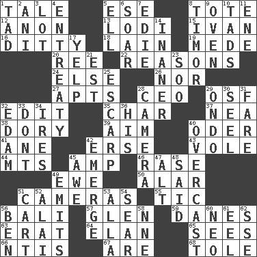 ACROSS 1. Lie 5. Compass dir. 8. Carry 12. At once, immediately (arch.) 13. Farming town in central California 15. _ the terrible 16. Simple song 18. (Had) reclined 19. Ancient Persian 20. To riddle 22. Thinks logically 24. Otherwise 26. And not 27. Flats, for short 28. Corporate head (abbr.) 29. Order of Saint Francis (abbr.) 32. Prepare for publication 35. Burn to charcoal 37. Teachers' org. 38. Small, narrow, flatbottom fishing boat 39. Direct toward a target or goal 40. River in Europe 41. One (Scot) 42. Celtic language 43. Short-tailed, large-bodied rat 44. Mountains (abbr.) 45. Electrical Unit 46. Raze (variant) 49. She-sheep 50. Having or resembling wings 51. Devices for capturing images 55. Nervous spasm 56. Indonesian resort city 57. Small, secluded valley 59. Natives or inhabitants of Denmark 63. Part of Q.E.F. 64. Style 65. Observes 66. Nuclear Threat Initiatives 67. "We ___ not amused" (Victoria) 68. Lacquered or enameled metalware DOWN 1. Bit 2. Cuckoo 3. Car dealer's back yard 4. Plea 5. Pipe bend 6. Fly high 7. Singer Brickell 8. The easternmost of the Lesser Sundas 9. Baking chamber 10. Bits 11. Compass dir. 14. More lacking in sense or substance 17. Sharp bark 21. Eastern Standard Time (abbr.) 23. "Barney Miller" actor Jack 25. Fortification 28. Device for capturing images 29. Southwest Nigerian state 30. Sew up the eyelids of hawks and falcons 31. Conductor's collection 32. Dutch treat 33. Do not 34. Angers 36. Part of HMS, perhaps 40. Cloudy 42. Develop 45. Deep reverence 47. The first octave above the treble staff 48. Expressed in words 49. Gives off 51. Draw slowly or heavily 52. Jai _ 53. Silent film actress Nazimova 54. Dry up 56. Benjamin's nick name 58. Compass dir. 60. Modern: prefix 61. Snakelike fish 62. Compass dir.