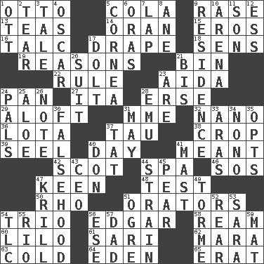 ACROSS 1. Von Bismarck 5. Root beer relative 9. To erase 13. Afternoon social gatherings 14. Northwest Algerian city 15. Greek god of love 16. Baby powder 17. Window treatment 18. Elected reps. 19. Thinks logically 21. Storage container 22. General guideline 23. Opera by Verdi 24. Baking dish 27. Call ___ day 28. Celtic language 29. At or to great height 31. Madame (abbr.) 32. Billionth: prefix 36. Globular water bottle used in Asia 37. The 19th letter of the Greek alphabet 38. Riding implement 39. Stitch closed the eyes of (a falcon) 40. 24 hours 41. Intended 42. Native of Scotland 44. Health resort 46. Distress signal 47. Peachy ____! 48. Trial 50. 17th letter of the Greek alphabet 51. Speakers 54. Musical group of three 56. _ Allan Poe 58. 480, 500 or 516 sheets of paper 60. _ and Stitch 61. Indian skirt 62. Hindu Mythology: god of death 63. Chilled 64. Genesis locale 65. Part of Q.E.F. DOWN 1. Baseball player Mel 2. Separate forcefully 3. Story 4. Motion picture award 5. Pupil covering 6. Mouths or openings 7. Infant locale 8. One (Scot) 9. Home 10. Sports stadium 11. Male offspring 12. Double-curved letter 17. Dunce 20. Set of matching outer garments 21. Altar cloth linen 23. "We ___ not amused" (Victoria) 24. Friends 25. Medicinal plant 26. Observe 28. Australian flightless bird 30. It jiggles the polygraph 31. Fifth month 33. Caspian sea tributary 34. Words to Nanette 35. Chooses 37. Make lace 40. Spanish title 41. Vertical spar for supporting sails 43. Corporate head (abbr.) 44. Put through a sieve 45. Lightbulb-shaped fruit 47. Shrimp-like planktonic crustaceans 49. Singer Mel 51. Legendary monster 52. Located in or toward the back 53. "Two Mules for Sister ____" 54. Affectionate concern, for short 55. River (Sp.) 56. Compass dir. 57. Male parent 59. Floor covering