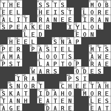ACROSS 1. Definite Article 4. Fast planes 8. Disorderly crowd 11. Snakelike fish 12. Robbery 14. Old wives' tales, e.g. 15. Set down 17. Indian princess (variant) 18. SW Asia republic 19. Orator 21. Xylene (variant) 23. Directed 24. Age 25. The bottom of a shoe or boot 27. Fastener 30. For each 31. Soft color 34. Mountains (abbr.) 37. Nanny (var.) 38. Plunders 39. Deep reverence 40. Pacific Standard Time (abbr.) 41. Portable computer 43. Actress Charlotte 44. Armed conflicts 45. Lyric poems 47. Lyricist Gershwin 49. Air pressure measure (abbr.) 50. Derisive sound 52. Leopard's kin 56. Three-handed card game 57. Potato state 60. Greater amount 61. Hyperbolic tangent 62. Ingested 63. French article 64. Ripen 65. Have the gumption 66. Consume DOWN 1. Afternoon social gatherings 2. Assist 3. Writer Wiesel 4. Fragment 5. Scorch 6. Shallow baking pan 7. Compass dir. 8. Person of subnormal intelligence 9. Spoken 10. Benjamin's nick name 13. John Ritter's dad 14. _ and Stitch 16. Lie 20. Seaweed 22. Slangy assent 25. Cloth borders 26. Part of Q.E.F. 27. Ceases 28. Remaining after all deductions 29. In addition 30. Infant food 32. Silent film actress Nazimova 33. Fly high 34. Female horse 35. It was, poetically 36. Perceive with the eye 42. Introduce or present, as a question 44. Armed conflict 46. South Vietnam president (1954) 47. Empty; void 48. Writer of Portnoy's Complaint (1969) 49. Give a jingle 50. Heroin 51. Standoff 52. "Mermaids" star 53. Lacquered or enameled metalware 54. Type of rug 55. Behest 56. R.R. building 58. Male parent 59. _ moment's notice (2 wds.)